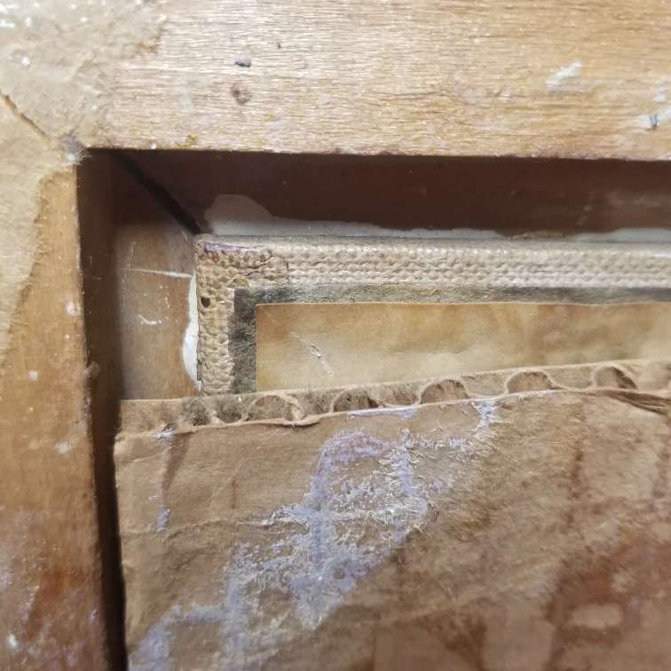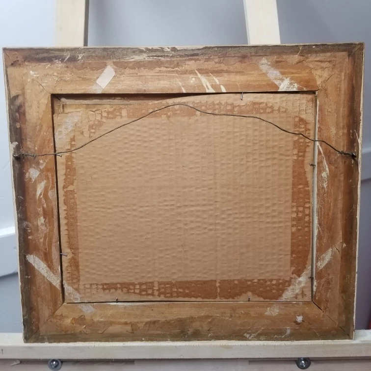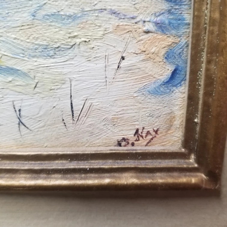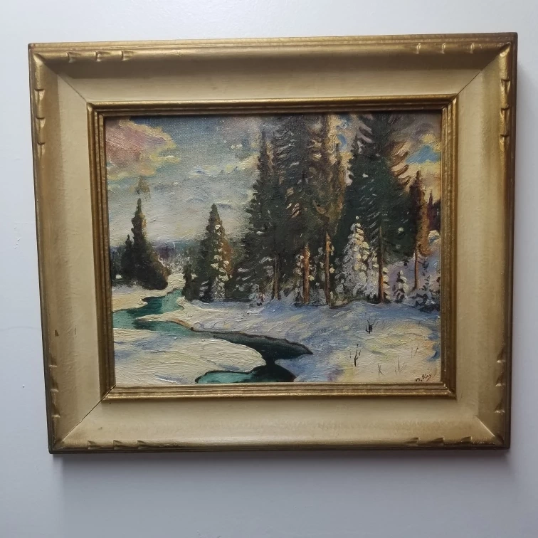 Framed winter scene. Oil on canvas. Gold coloured frame. Artist signature visible. Shows wear consistent with age.