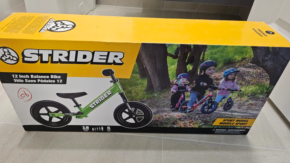Brand new Strider 12 Sport balance bike. Green colour. Lightweight design. Easy assembly. Suitable for children aged 18 months to 5 years.