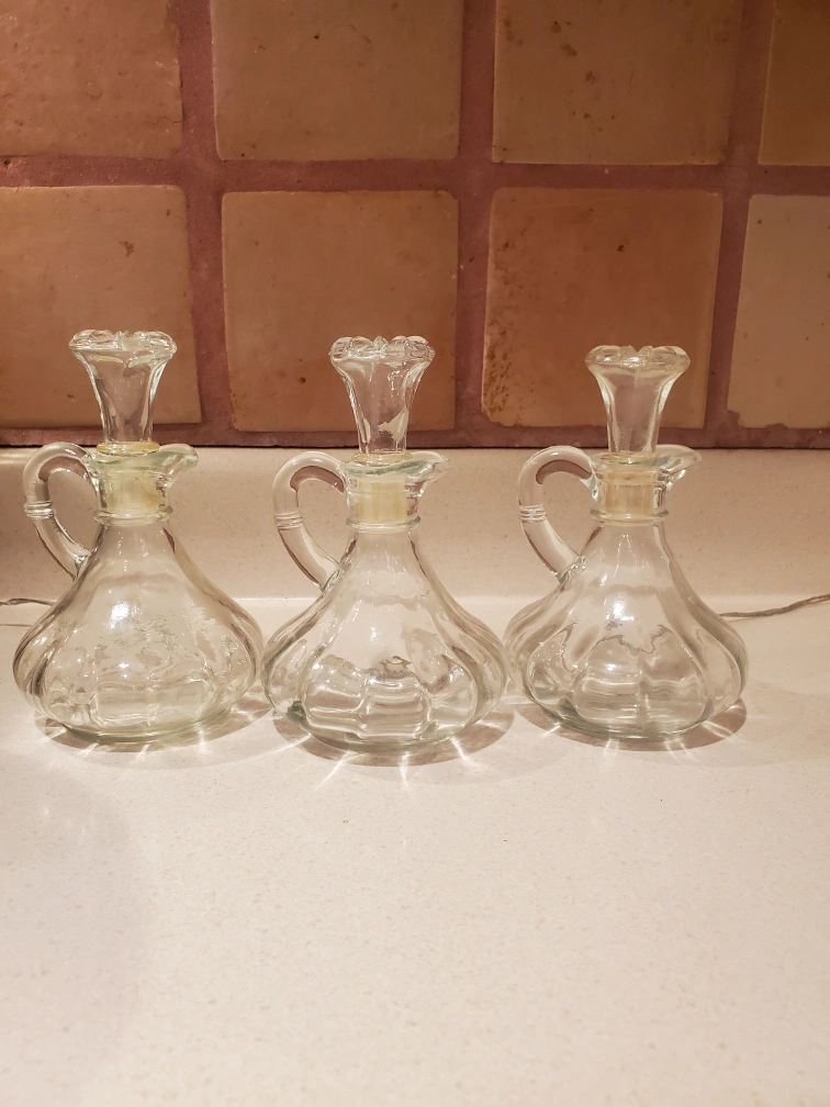 This is for a set of 3 Vintage Anchor Hocking Glass Cruet with glass Stoppers. they measure approximately 14cm tall. comes as a set of 3.