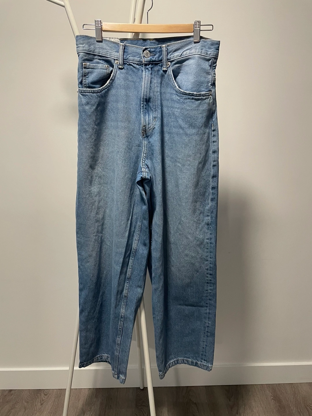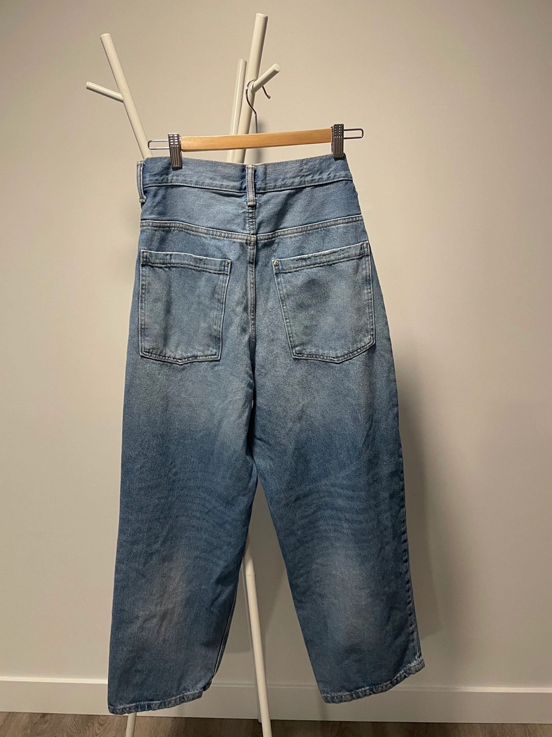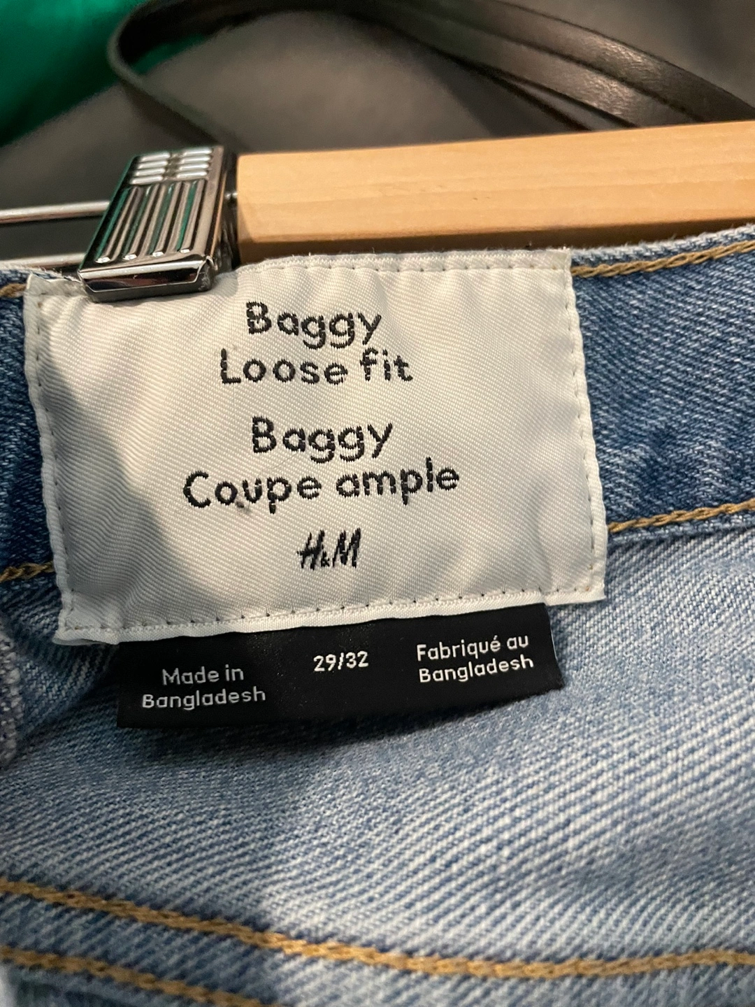 Light wash blue denim jeans. Baggy, loose fit. Cropped length. Made in Bangladesh. Size M.