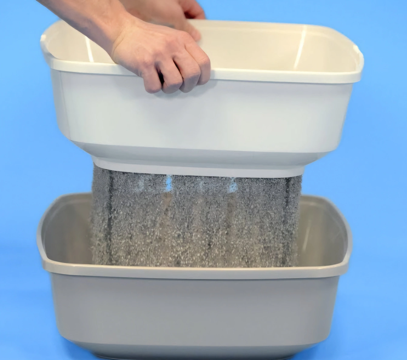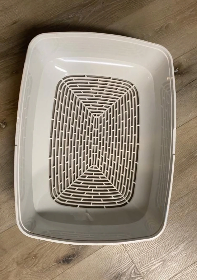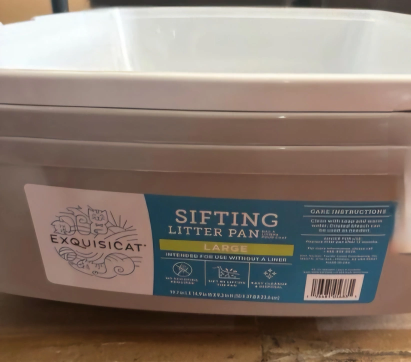 Exquisicat's white and tan sifting litter pan makes a perfect choice for both you and your cat. The litter pan is made for use without a liner with no scooping required, and provides a sifting mechanism by simply lifting the pan. No scooping required. The end result is a litter pan that offers easy clean-up and disposal. Includes 3 pieces (2 solid pans and one sifting pan with slits at the bottom). Only used once for travel.