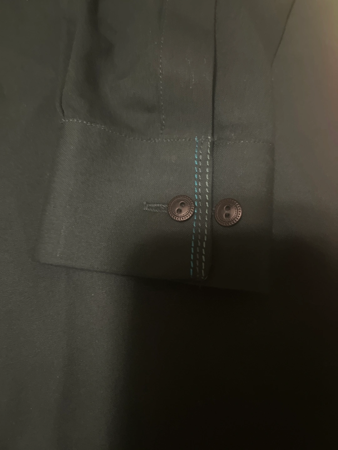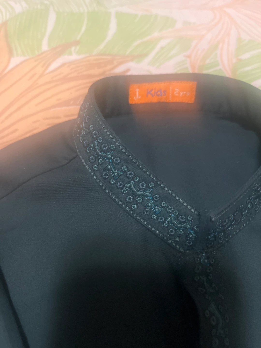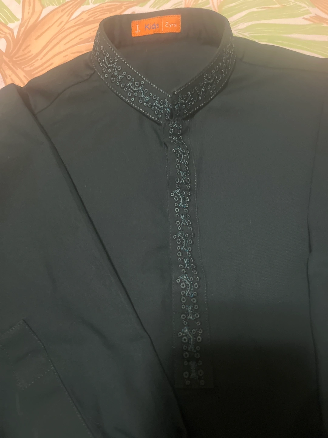 Boys' dark green kurta pajama set. Size 2 years. Features decorative embroidery detail at the collar and placket. Long sleeves, button cuffs. Suitable for special occasions or everyday wear.