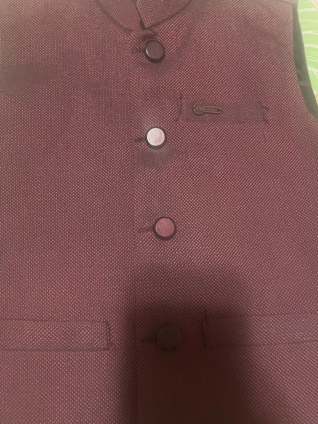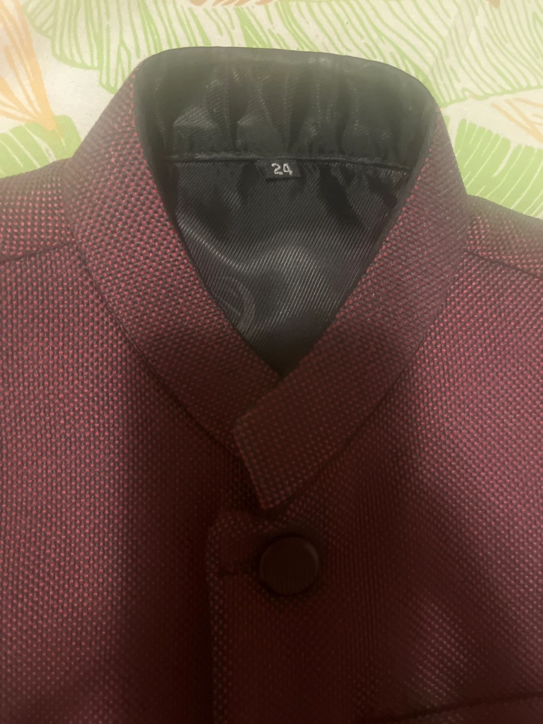 Men's burgundy Nehru-style vest. Size 24. Features a mandarin collar and button closures. Two pockets. Sleek design, ideal for formal occasions.