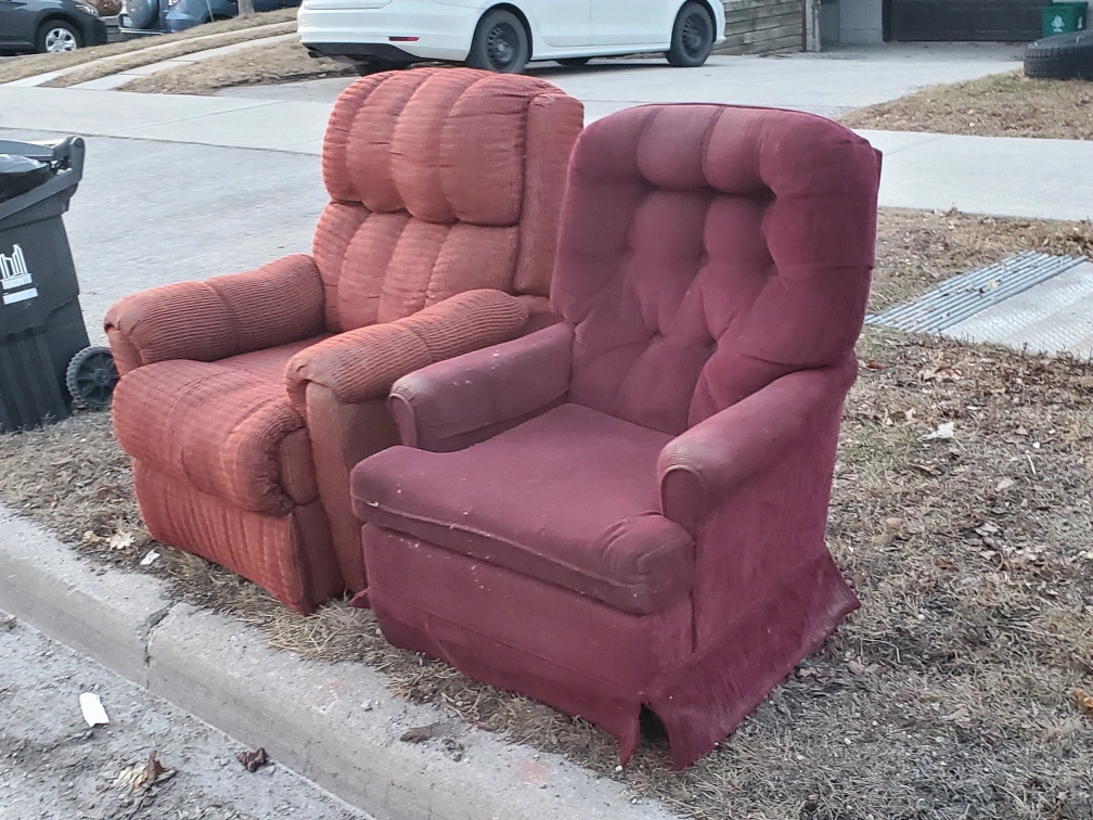 The one on the left is a lazy boy. The one on the right is a swivel chair. Both are well used, but still work.