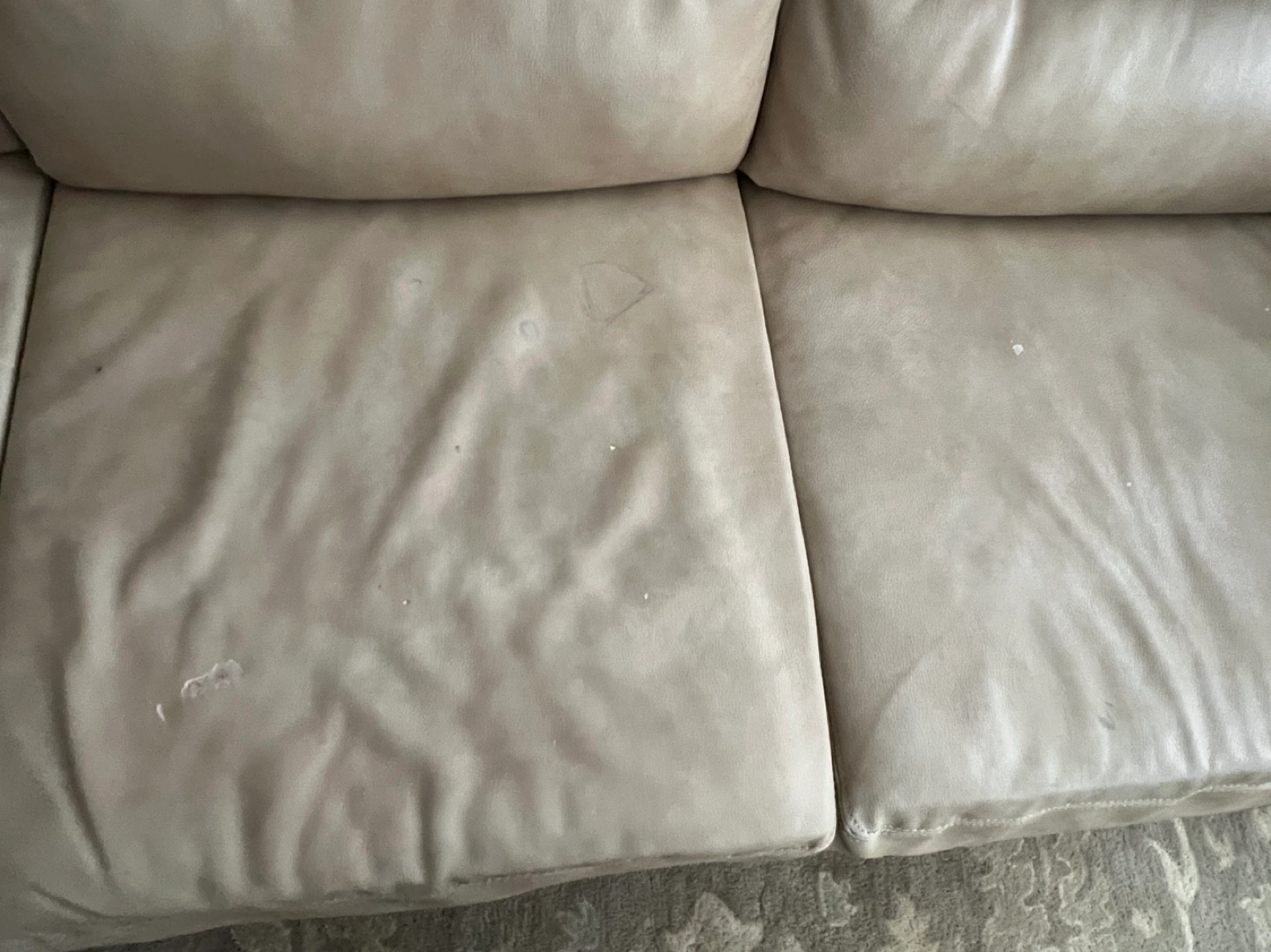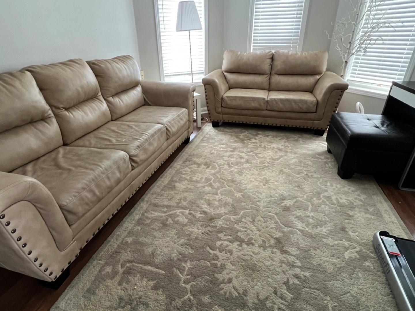 Matching beige leather sofa and loveseat. Nailhead trim detail. Some minor wear and tear. Good condition for its age.