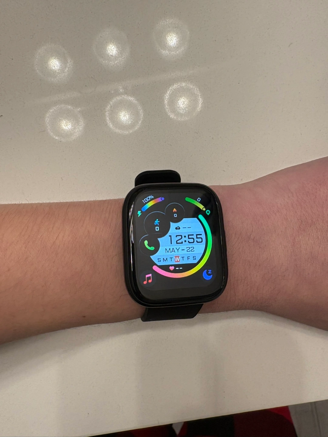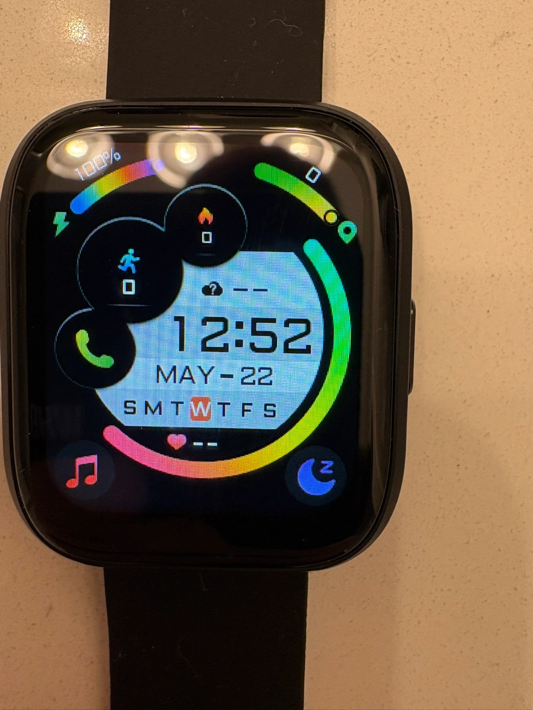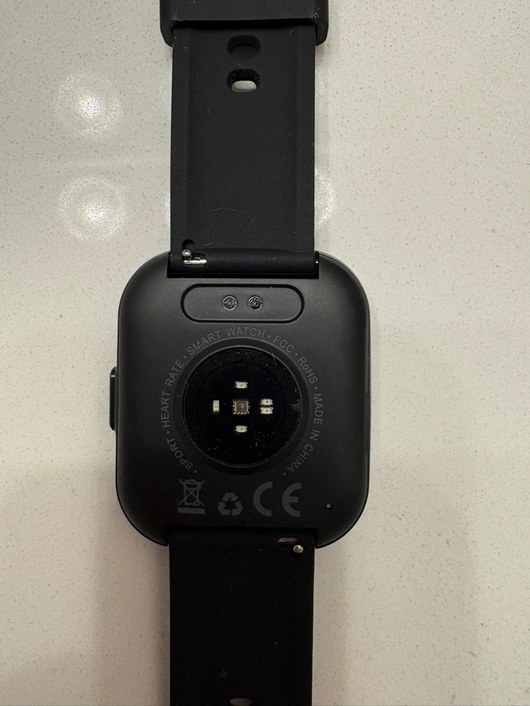 Black smart watch with silicone band. Features heart rate monitor and multiple display options. Includes original box.