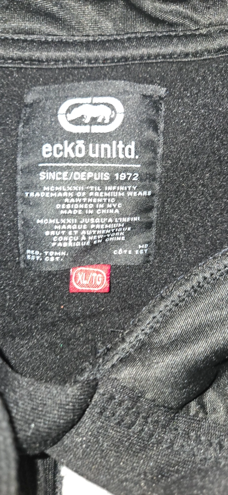 Black Eckō Unltd. hoodie. Features large embroidered logo on front. Size XL/TG. Made in China.