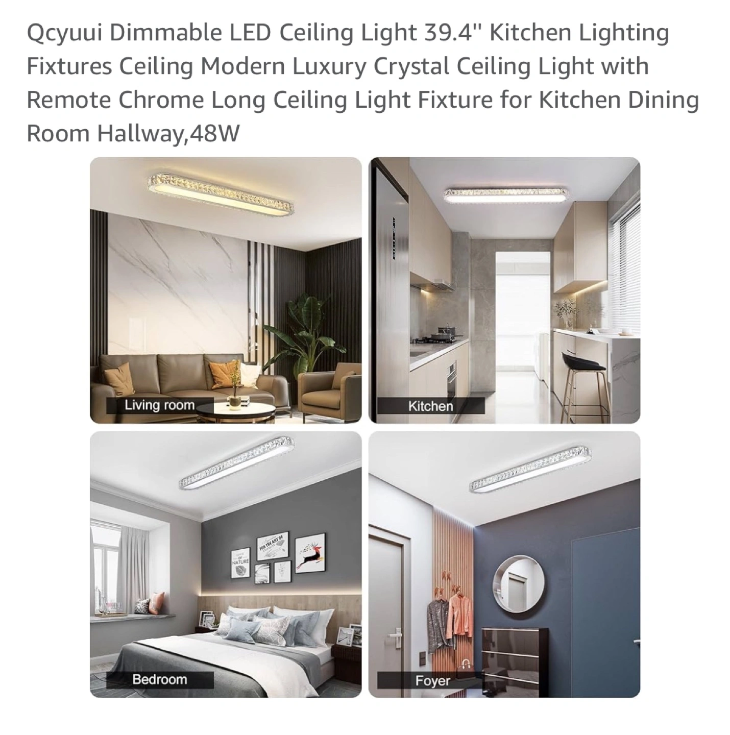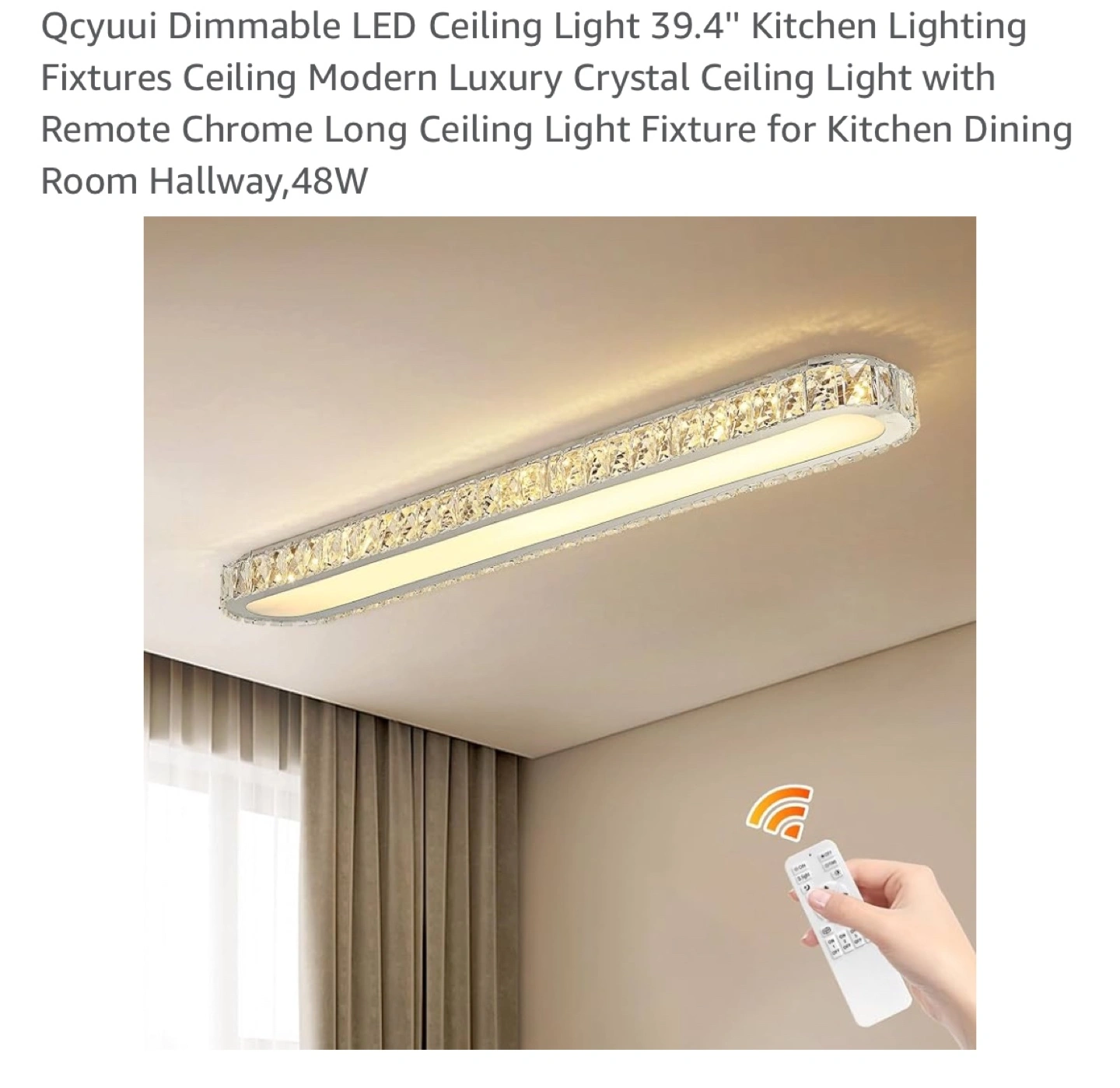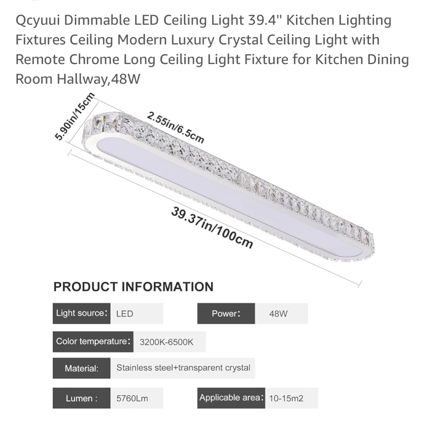 145Brand Qcyuui Colour Dimm/48w/39.4in/Crystal Material Stainless Steel, crystal Style Modern&Postmodern&Simplicity Light fixture form Close to Ceiling Room type Living Room, Home Office, Study Room, Dining Room, Resturant, Coffee Shop, Kitchen Island, Bedroom Crystal Ceiling Light Fixture Specification: Linear ceiling light size: 39.4(L)x5.9(W)x2.5(H)inches. Power: 48W, 5760lm, Voltage: 110V. Color temperature: 3200K-6500K. NOTE:This closet ceiling light is not compatible with wall dimmer switches. Please use a standard on/off wall switch and the provided remote control for dimming and color temperature adjustment. Dimmable and Memory Function: The Modern LED Ceiling Light can changed color temperature and brightness to meet different requirements by the remote control. This Dimmable led ceiling light comes with a memory function that allows you to set the light color and brightness(keep the kitchen light fixture turn on at least 20S). Next time you turn on this long ceiling light,it will keep the setting last time. Premium Material and Wide Application: Ceiling light fixture is made of polished stainless steel and crystal slices, creating a high quality, exquisite ceiling lamp. When it is illuminated, it adds a touch of glamour and provides a brilliantly bright lighting effect.The long led ceiling light brings a touch of luxury to any room, perfect for closet, hallway,cloakroom,kitchen, bedroom, laundry room, living room, dining room, corridor, aisle, etc. (Application area:10- 15㎡) Energy Saving and Eye-Protection: Our linear light fixture use high-quality LED chips, energy Saving, longer lifespan, used more than 20,000 hours under normal voltage, making it an effective lighting fixture for your home.Stable and uniform light output without flickering, or glare, providing a healthy light environment for your eyes.