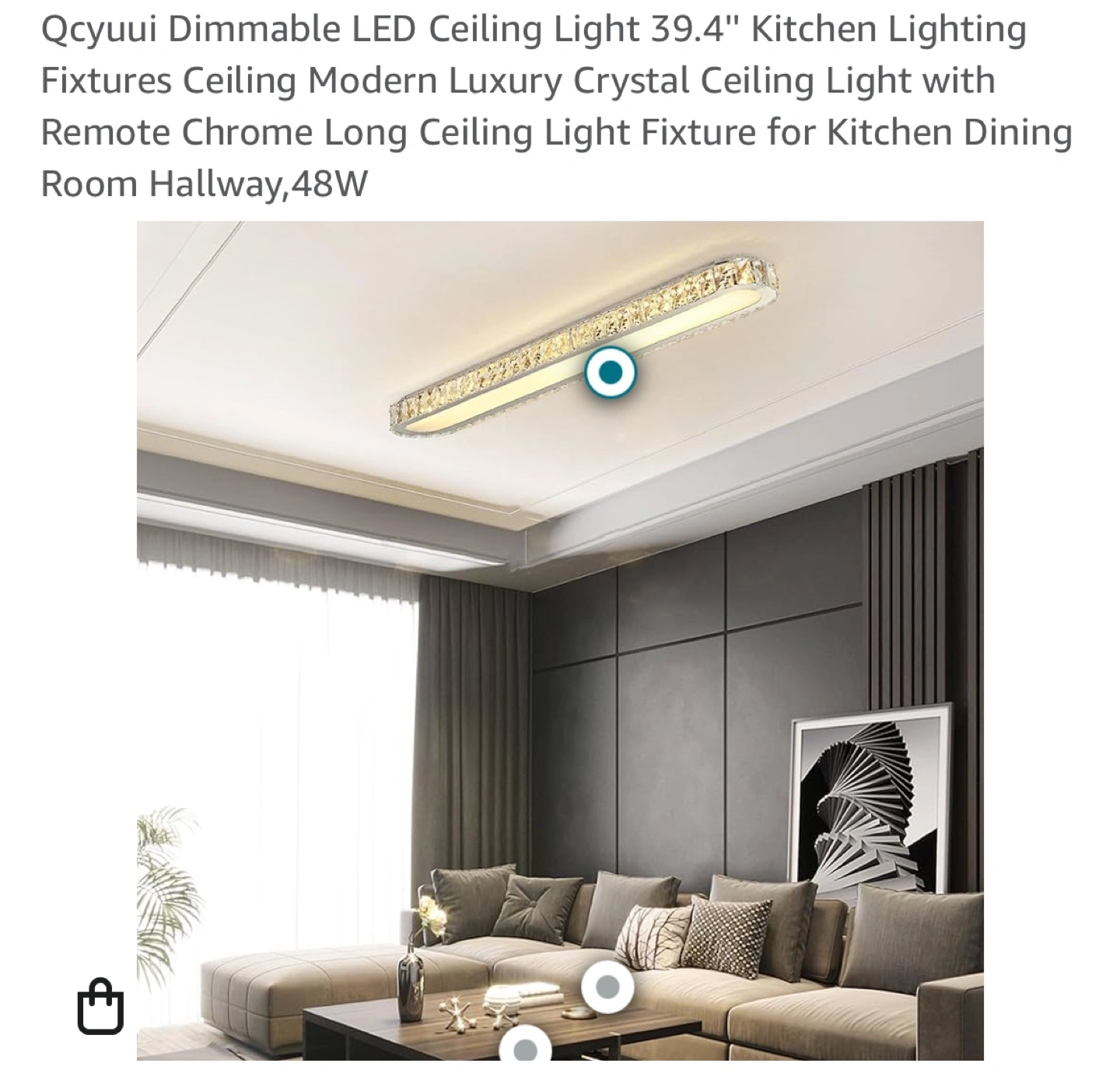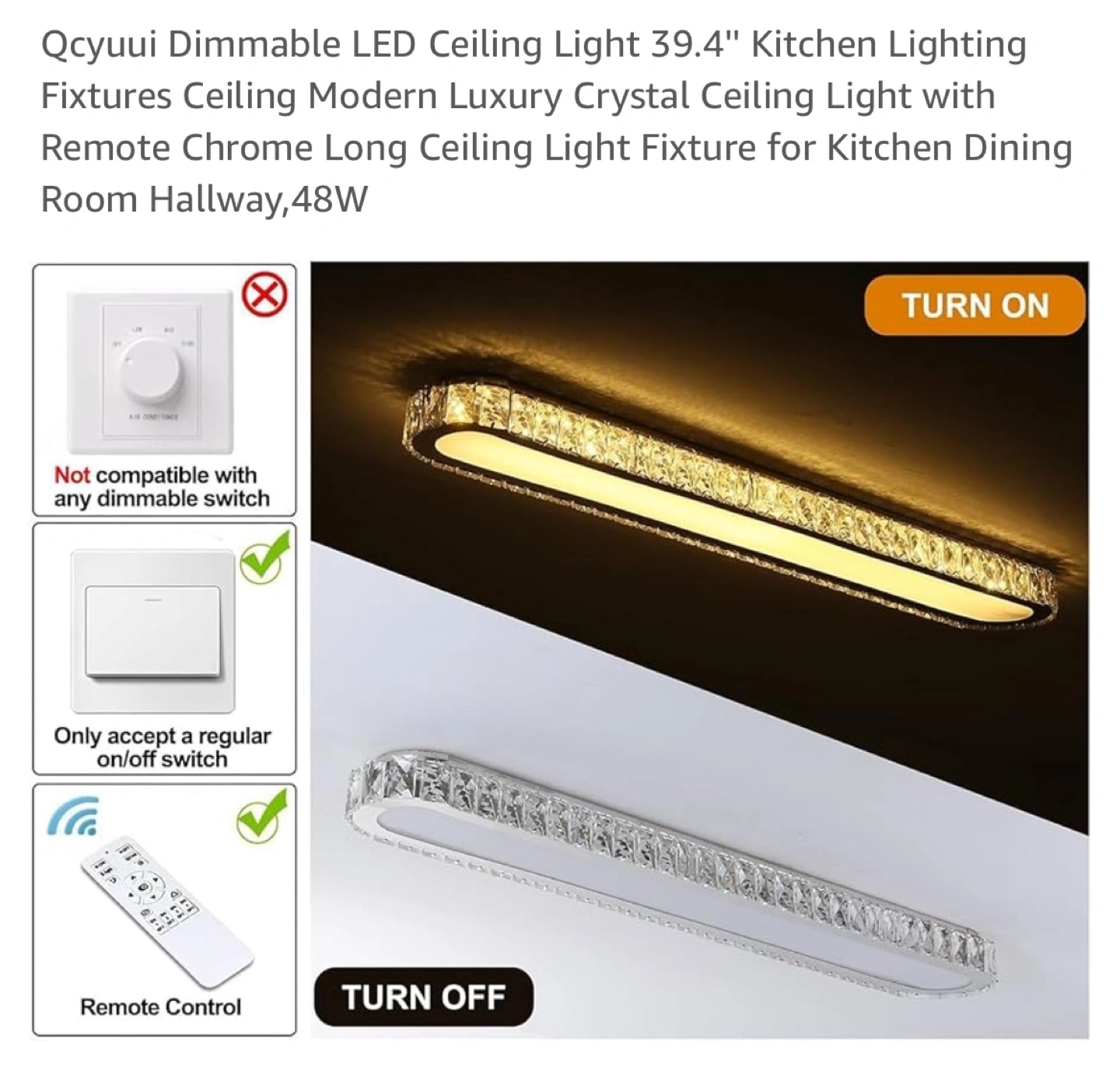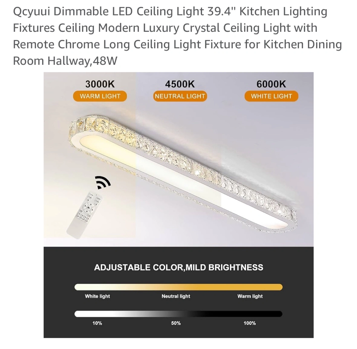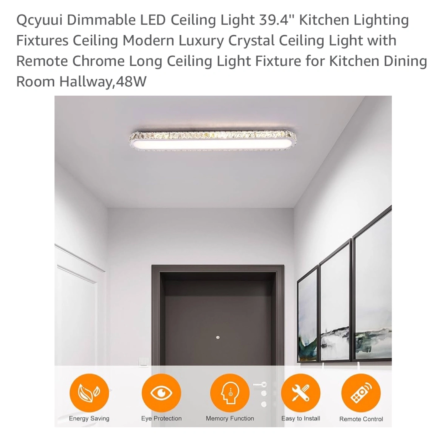 145Brand Qcyuui Colour Dimm/48w/39.4in/Crystal Material Stainless Steel, crystal Style Modern&Postmodern&Simplicity Light fixture form Close to Ceiling Room type Living Room, Home Office, Study Room, Dining Room, Resturant, Coffee Shop, Kitchen Island, Bedroom Crystal Ceiling Light Fixture Specification: Linear ceiling light size: 39.4(L)x5.9(W)x2.5(H)inches. Power: 48W, 5760lm, Voltage: 110V. Color temperature: 3200K-6500K. NOTE:This closet ceiling light is not compatible with wall dimmer switches. Please use a standard on/off wall switch and the provided remote control for dimming and color temperature adjustment. Dimmable and Memory Function: The Modern LED Ceiling Light can changed color temperature and brightness to meet different requirements by the remote control. This Dimmable led ceiling light comes with a memory function that allows you to set the light color and brightness(keep the kitchen light fixture turn on at least 20S). Next time you turn on this long ceiling light,it will keep the setting last time. Premium Material and Wide Application: Ceiling light fixture is made of polished stainless steel and crystal slices, creating a high quality, exquisite ceiling lamp. When it is illuminated, it adds a touch of glamour and provides a brilliantly bright lighting effect.The long led ceiling light brings a touch of luxury to any room, perfect for closet, hallway,cloakroom,kitchen, bedroom, laundry room, living room, dining room, corridor, aisle, etc. (Application area:10- 15㎡) Energy Saving and Eye-Protection: Our linear light fixture use high-quality LED chips, energy Saving, longer lifespan, used more than 20,000 hours under normal voltage, making it an effective lighting fixture for your home.Stable and uniform light output without flickering, or glare, providing a healthy light environment for your eyes.