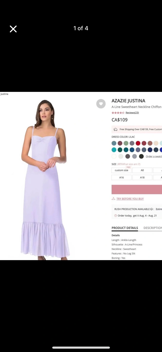 Buy & SellAzazie Justina Lilac A-Line DressAzazie Justina Lilac A-Line Dress$65A-line sweetheart neckline chiffon dress. Ankle-length with boning. Lilac colour. No leg slit.ConditionGoodSizeA10BrandAzazieWHERE TO MEETCheck LocationView MapSELLERSarahMaple171 review0 chats·1 favorites·16 views