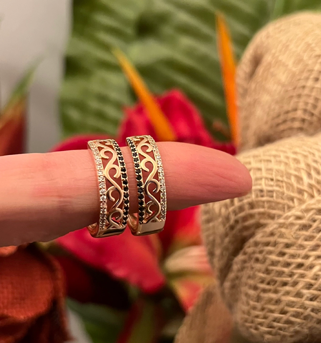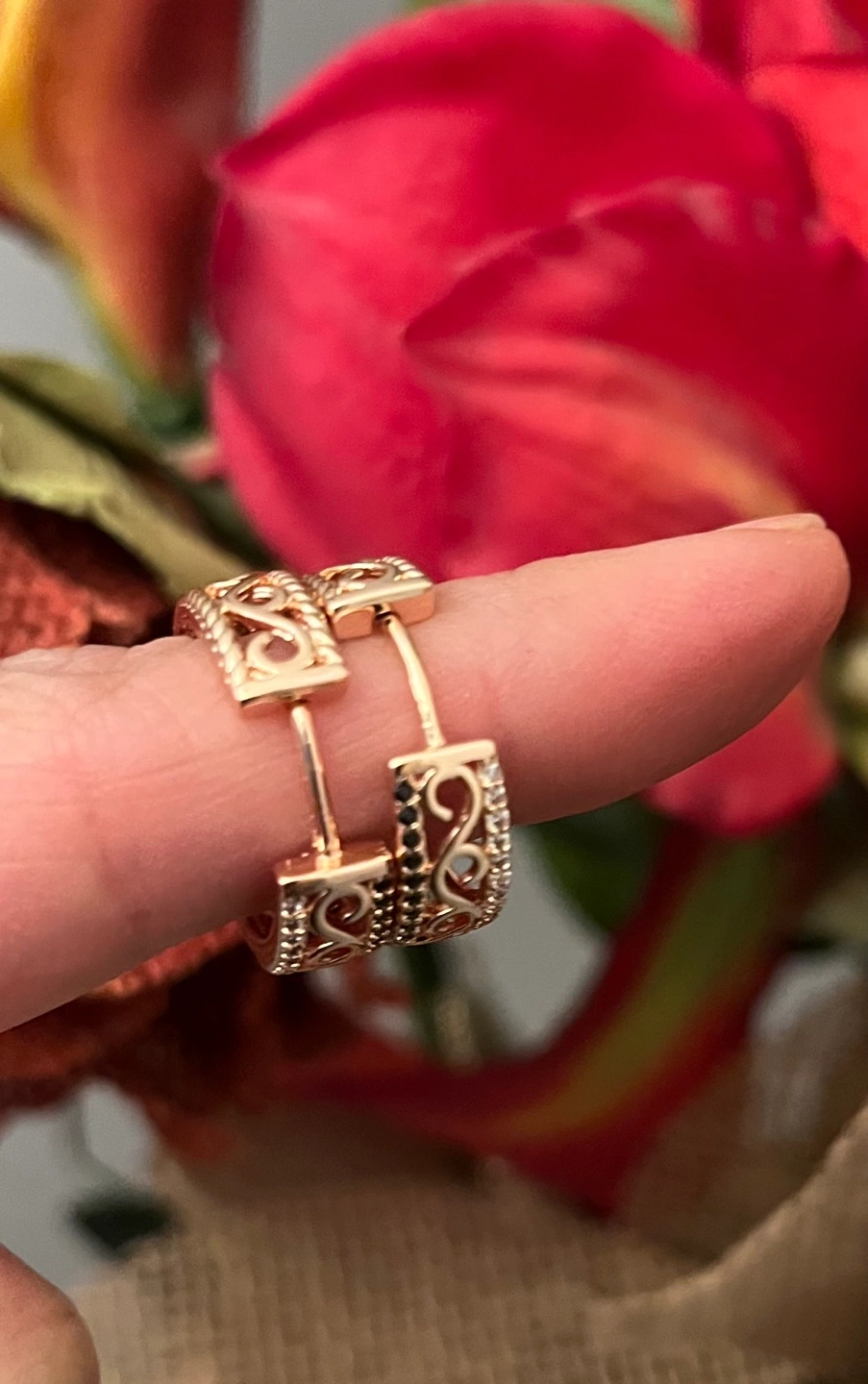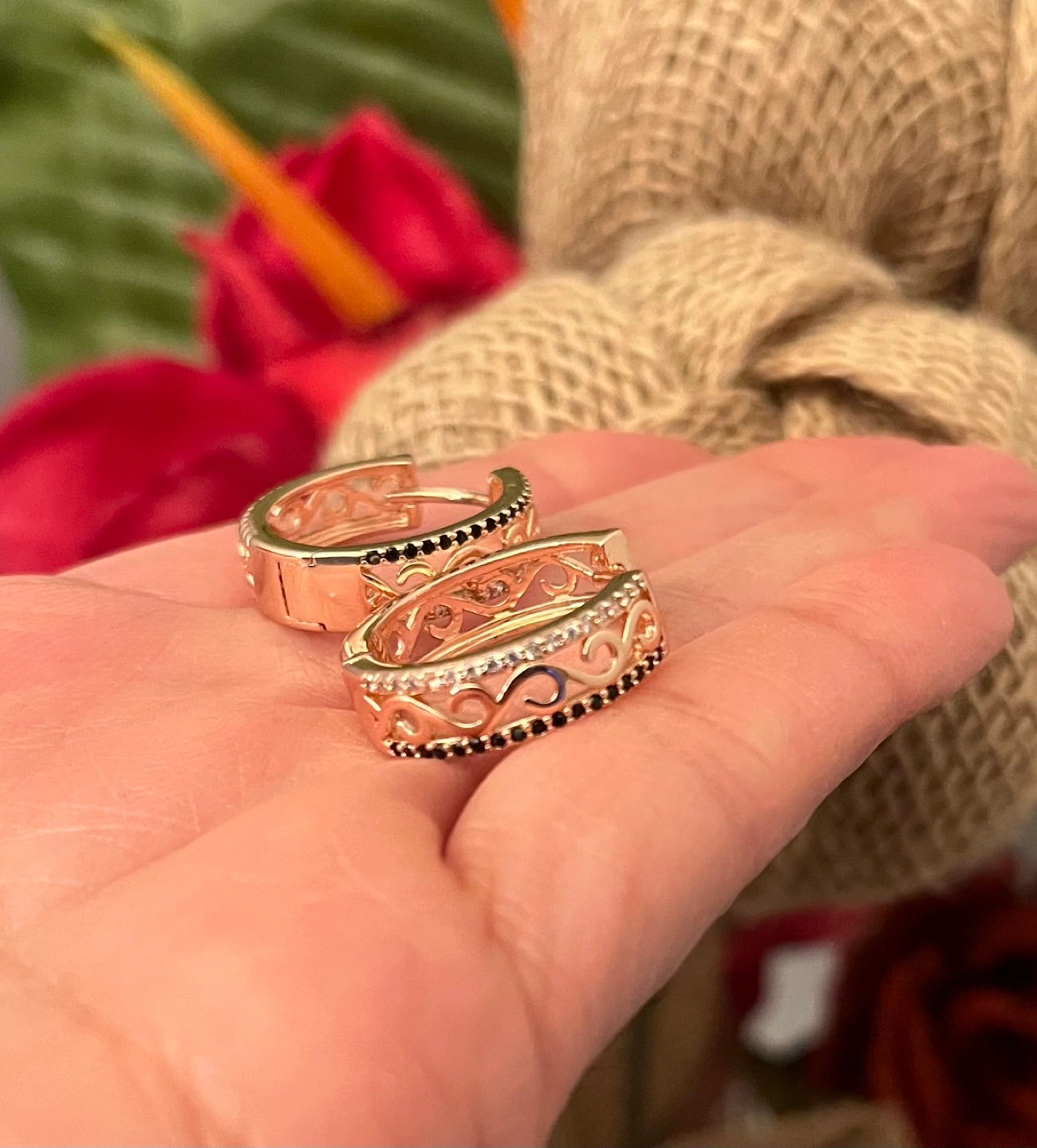 125Elegant rose gold hoop earrings. Features intricate filigree design. Accented with black and white cubic zirconia stones. Approximately 2 cm in diameter. Double gold plated