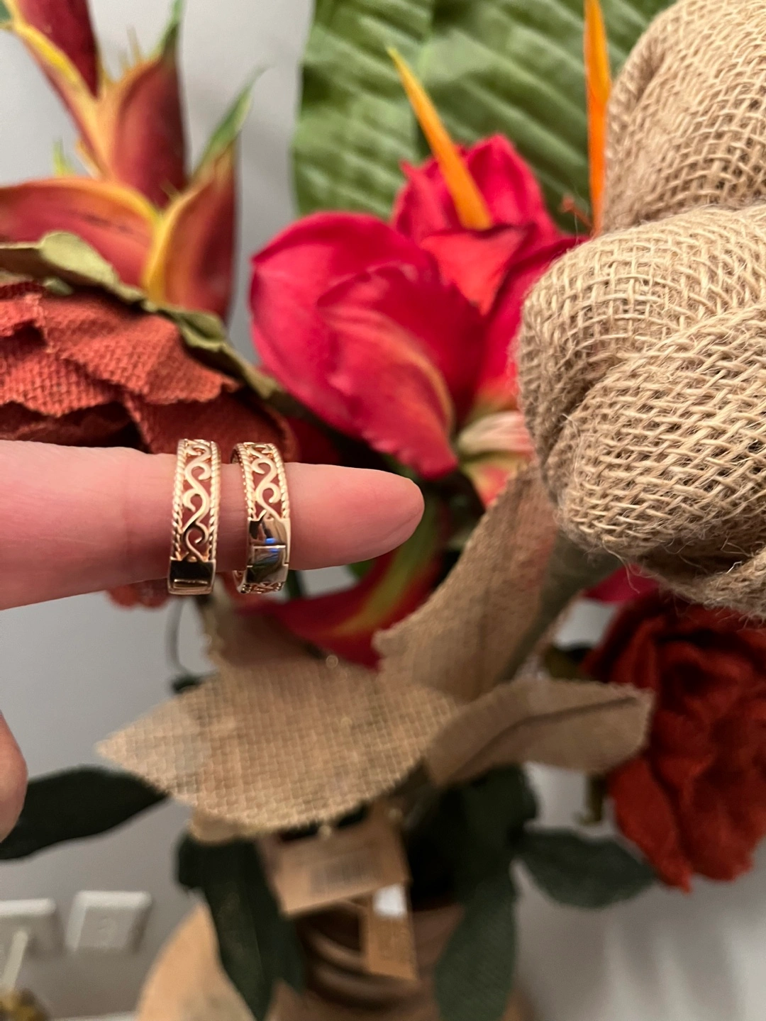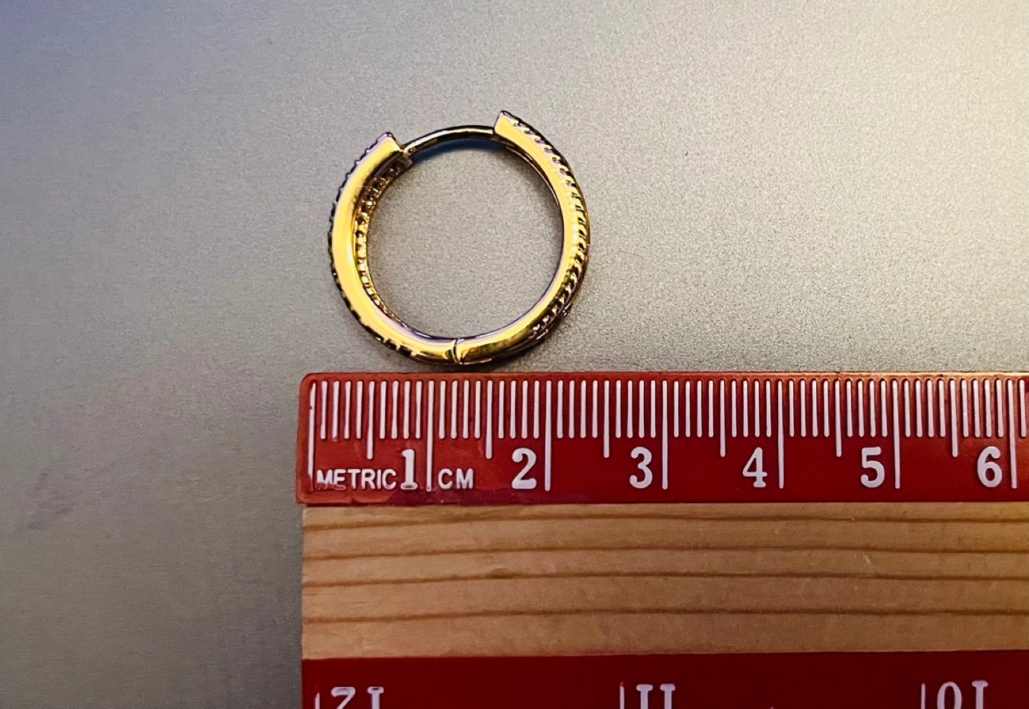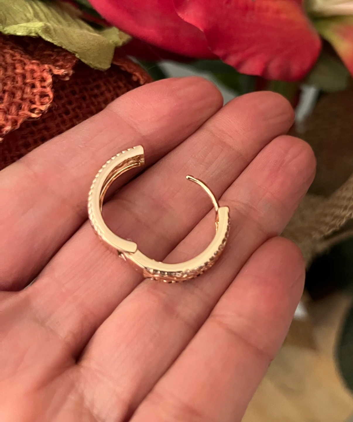125Elegant rose gold hoop earrings. Features intricate filigree design. Accented with black and white cubic zirconia stones. Approximately 2 cm in diameter. Double gold plated