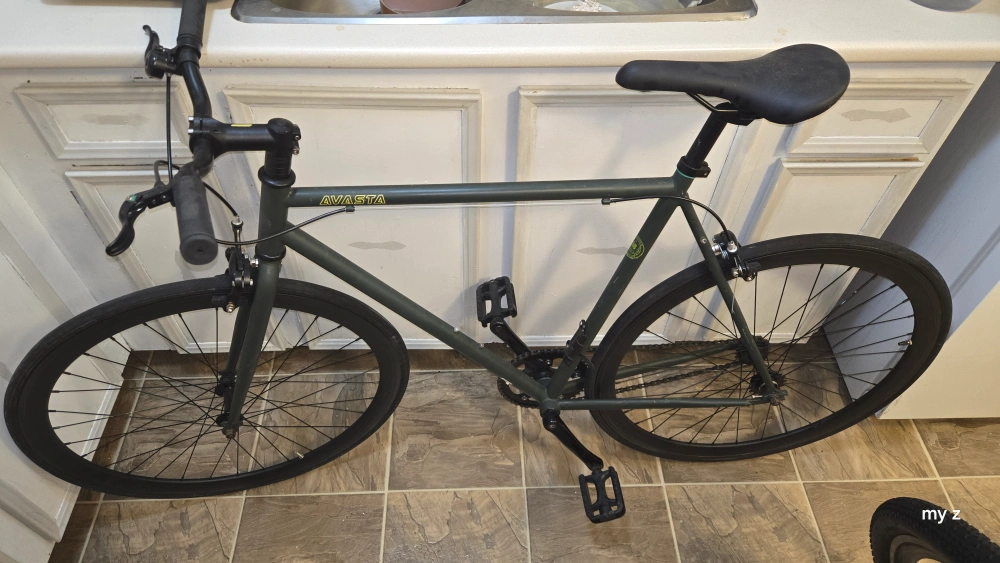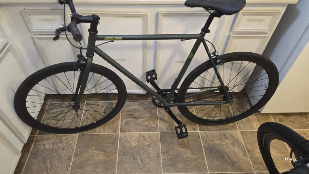 92Used Avalista fixie bicycle. Dark green frame, black wheels and components. Good condition.