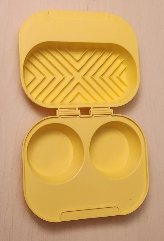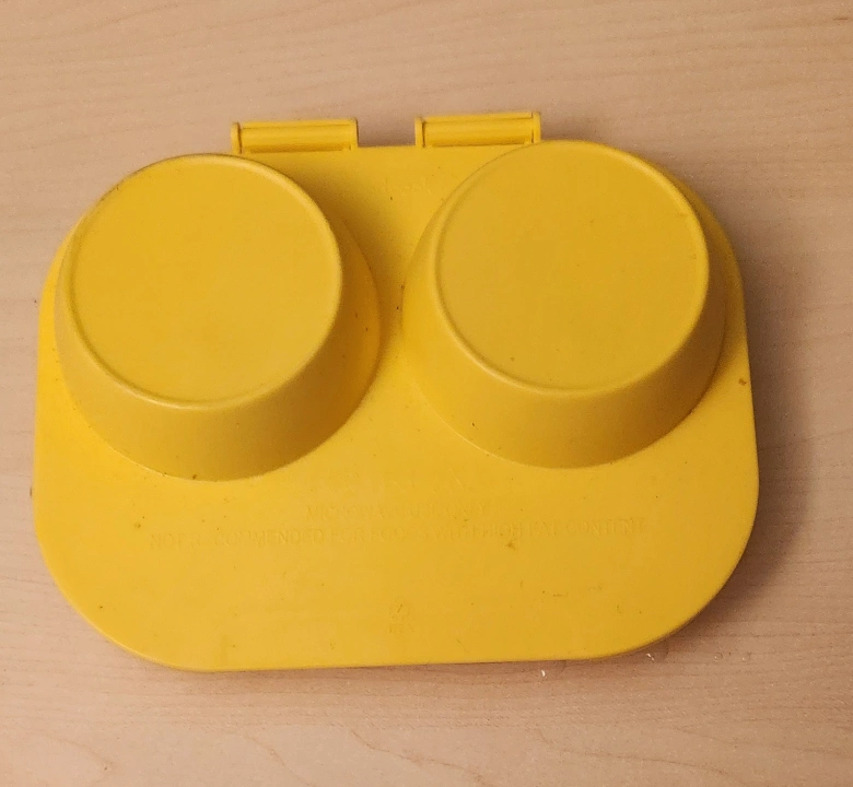 365Yellow plastic egg cooker. Two-cup design. Grill design on top. Microwave safe.