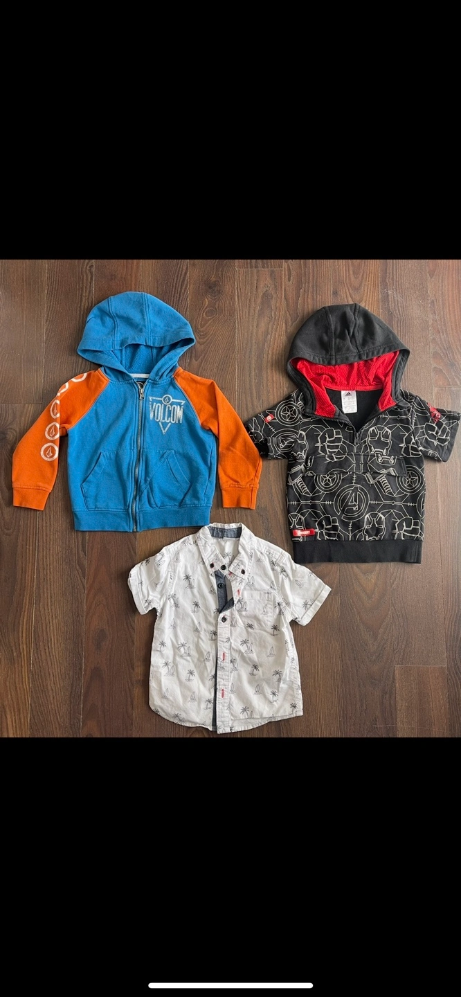Includes t-shirts, pants, hoodies, and a button-up shirt. Various colours and patterns. Great for everyday wear.