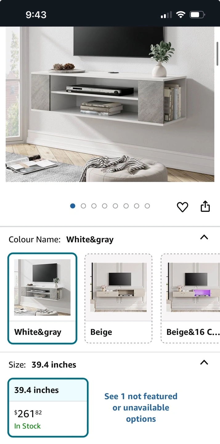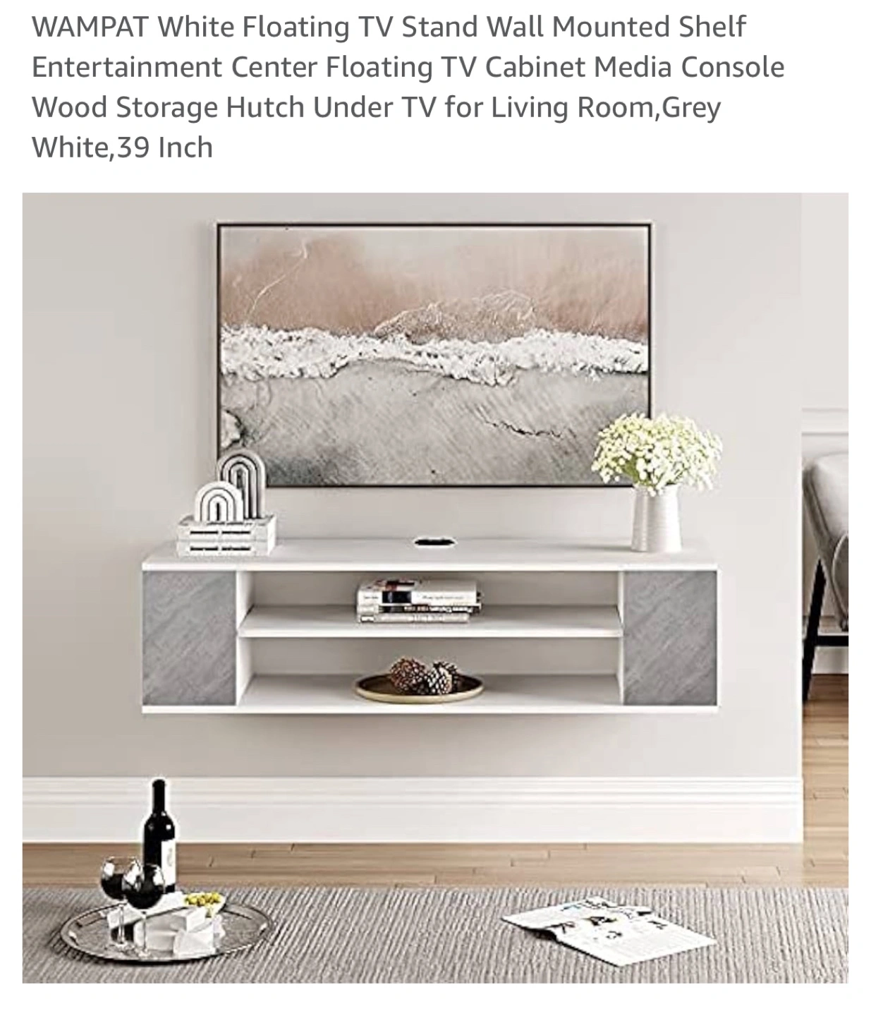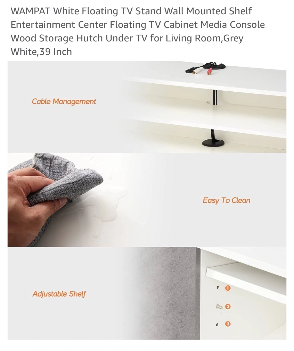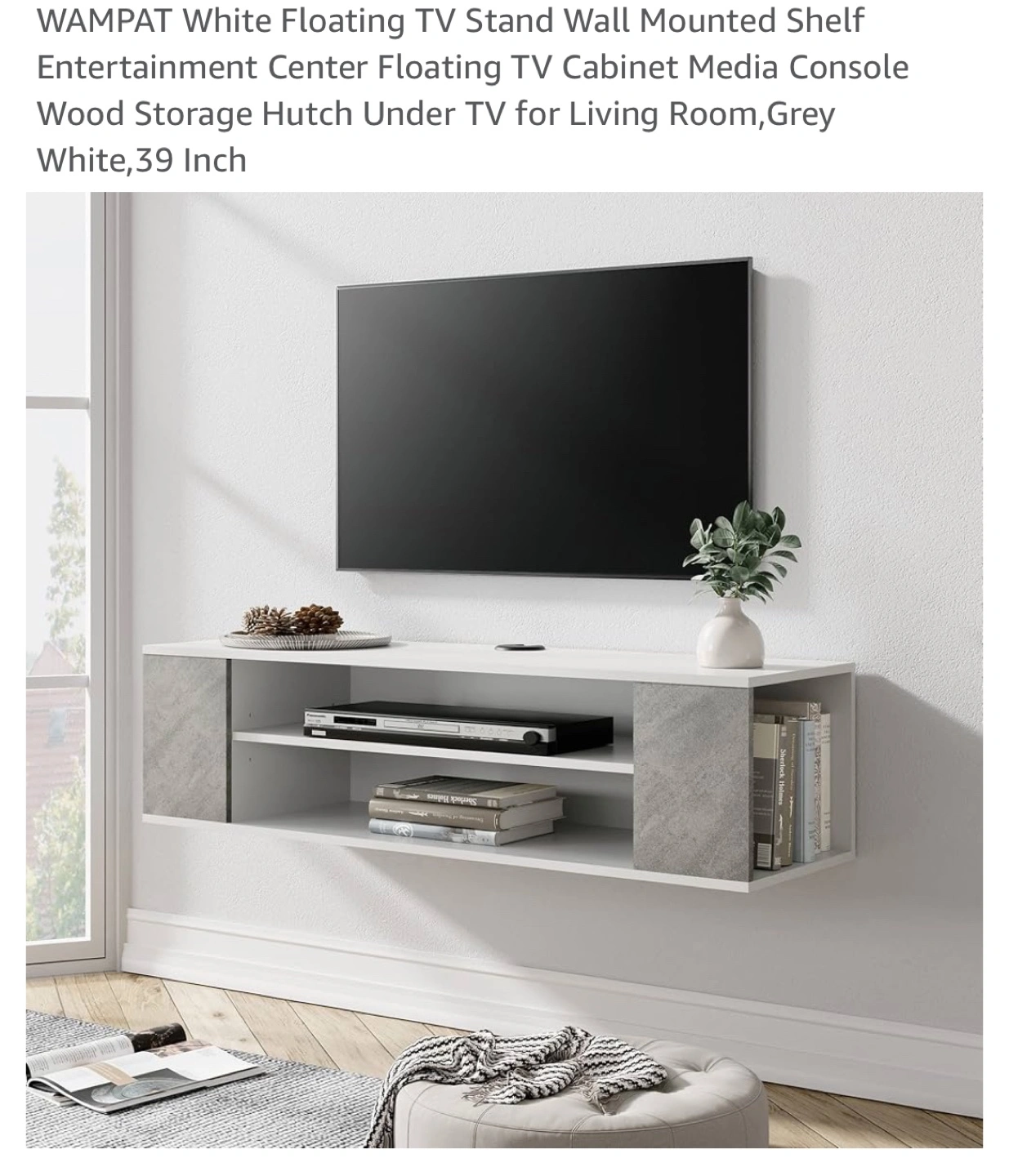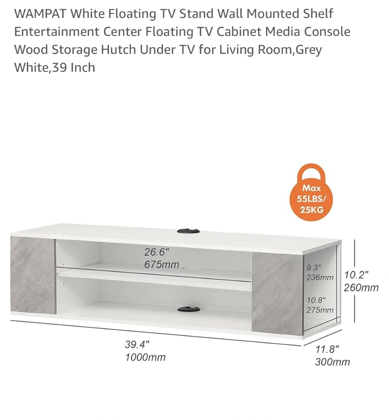 145Material Wood Mounting type Wall Mount Room type Living Room Shelf type Floating Shelf Number of shelves 2 Special feature Heavy Duty 【Storage Under TV】Wall mounted console shelf,Keep the floor space under your television clear by storing TV equipment on the media console's wall mounted shelves.Cable Holes for hiding messy wires keeping your stuff neatly organized and within reach! 【Electronic Organized Shelf】There are 3-level adjustable shelf for you to choose. You can adjust the shelf height according to your storage needs.The floating wall frame is not only suitable for storing routers, set-top boxes, fixed telephones, etc. It can also be used as a storage shelf for toys, CDs, etc. It is suitable for your room furniture. 【Stylish and Versatile】 Floating white tv stand media shelf can complement any style of room or furniture. Wall-mounted TV stands are both functional and decorative, tv stand long modern,modem rack shelf!It will add elegance and vitality to your bedroom, living room, media room, and office. 【Space Saving】Wall mounted console shelf,Keep the floor space under your television clear by storing TV equipment on the media console's wall mounted shelves.Cable Holes for hiding messy wires keeping your stuff neatly organized and within reach!