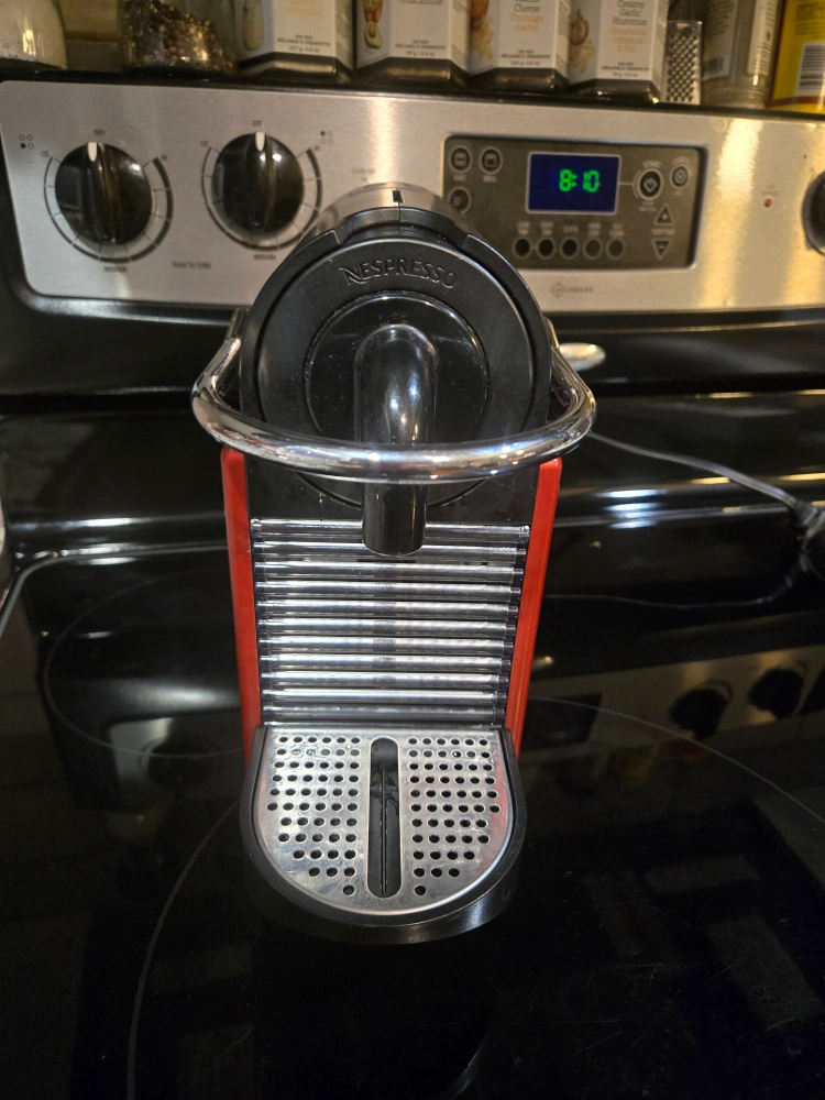Red Nespresso Essenza Mini coffee machine. Compact design, easy to use. Includes descaling kit and 100 coffee capsules. Pre-owned but well loved and cared for. Excellent condition. Also comes with an accessory kit to refill your own pods compatible with the machine.