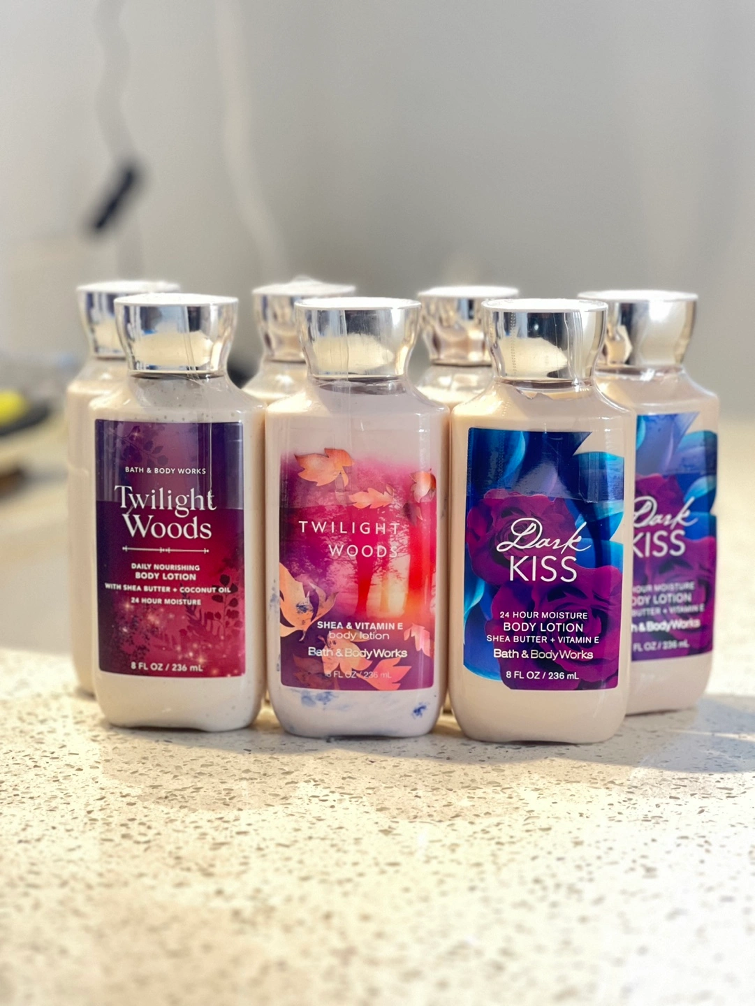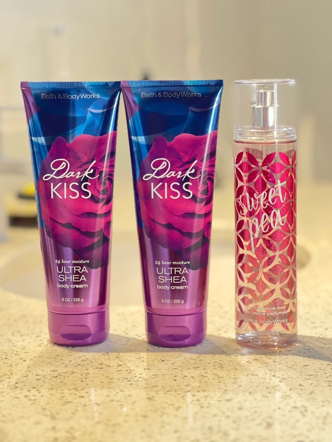 Bath & Body Works bundle. Includes two tubes of Dark Kiss Ultra Shea Body Cream and one Sweet Pea fragrance mist. Also includes several mini Twilight Woods and Dark Kiss Shea & Vitamin E body lotions. Dark Kiss Ultra Shea Body Cream $15 each Sweet Pea fragrance mist $10 Twilight Woods and Dark Kiss Shea & Vitamin E body lotions $13 each