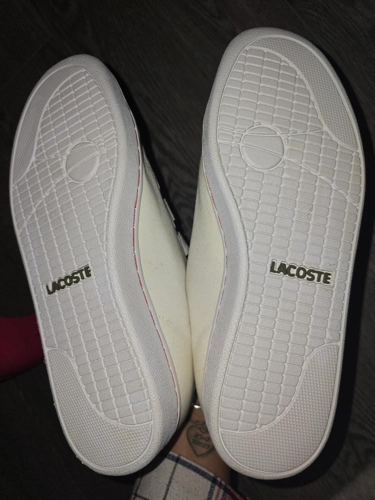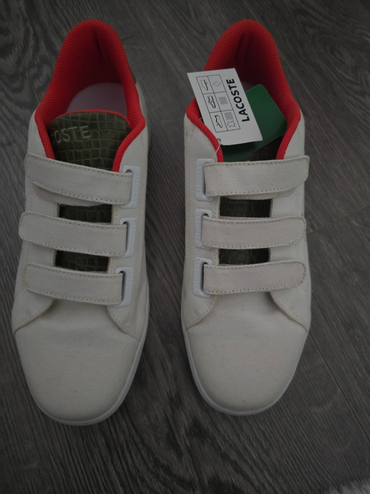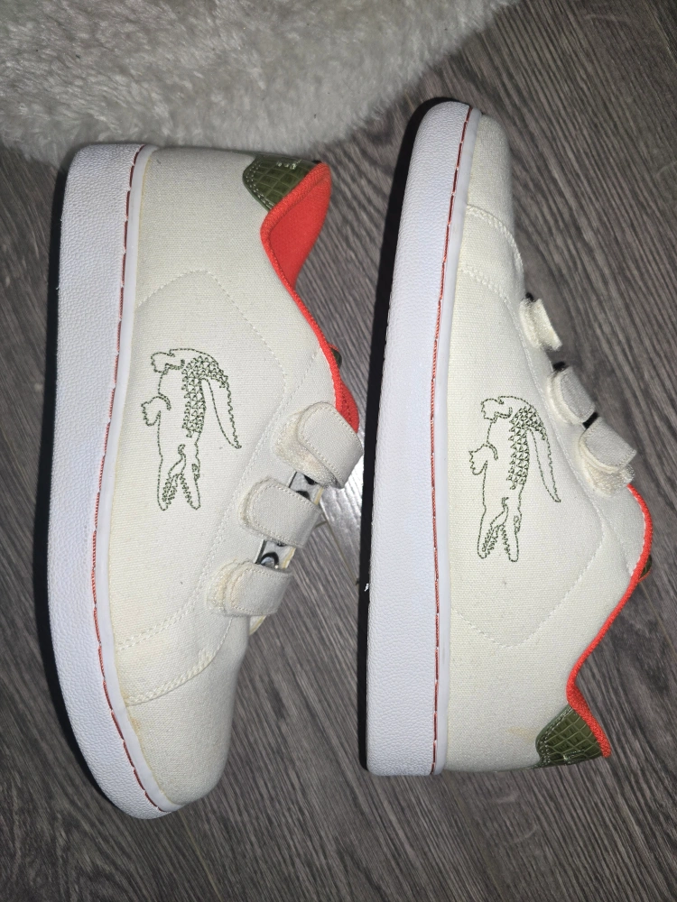Cream white-coloured velcro sneakers. Features a green crocodile logo and orange accents. New with tags and box, never worn.