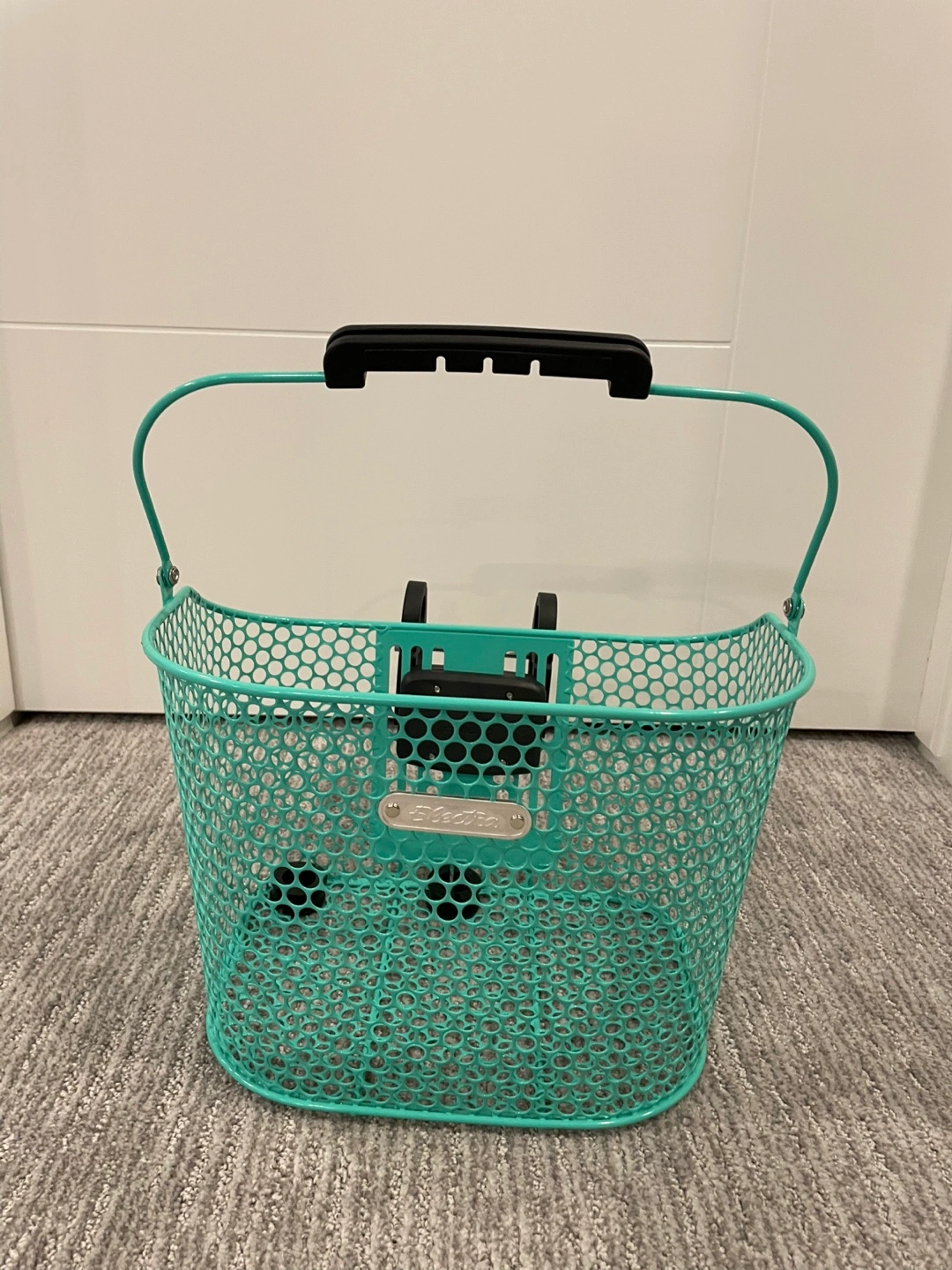 Electra bicycle basket with handle. Easy removal. Mint green colour. Metal construction. Includes mounting hardware. Great for carrying groceries or other items.
