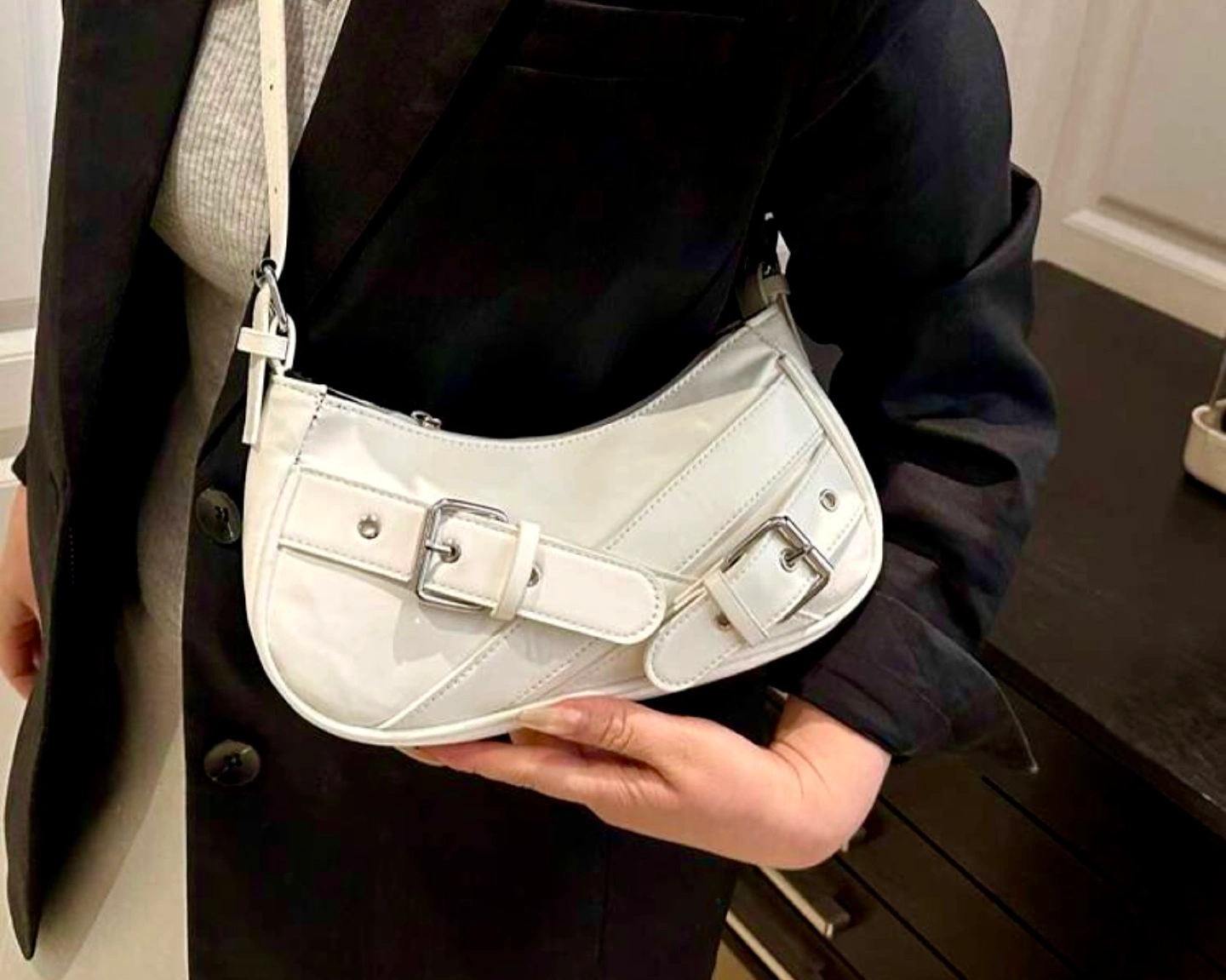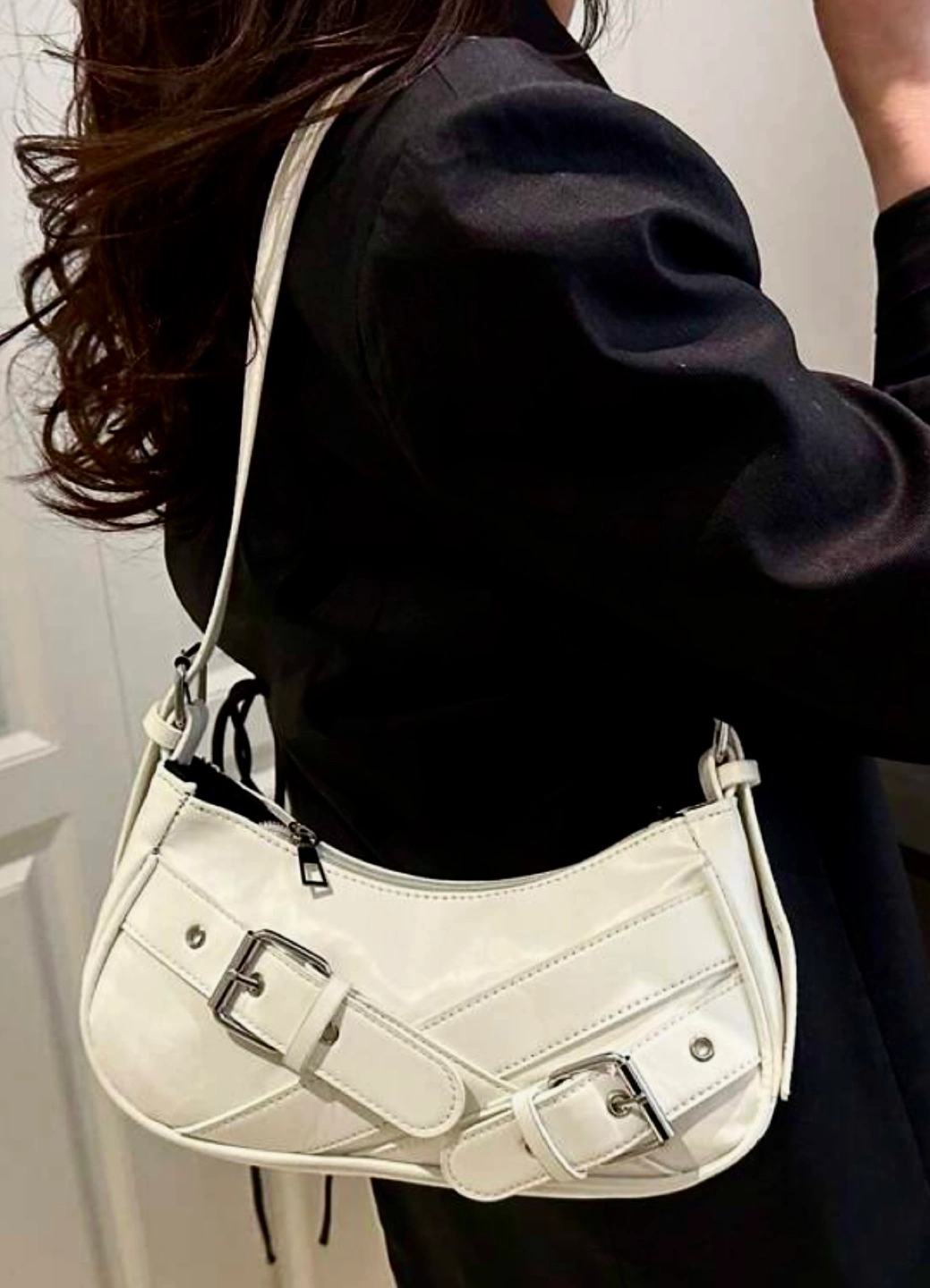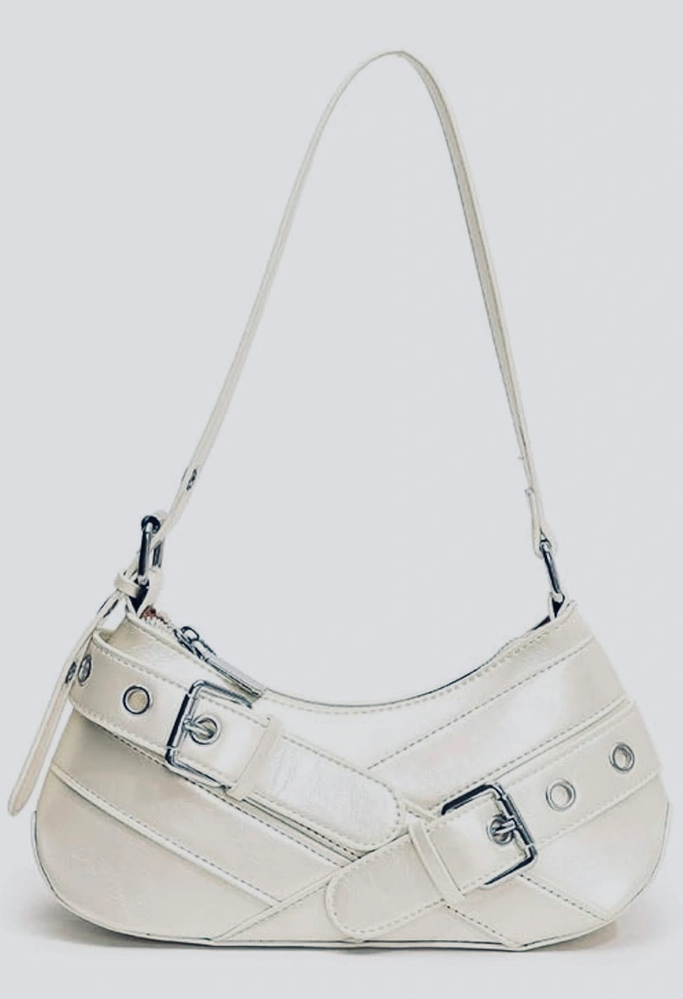 Features a curved silhouette, silver buckles, shoulder strap. Zipper closure. Cool style look