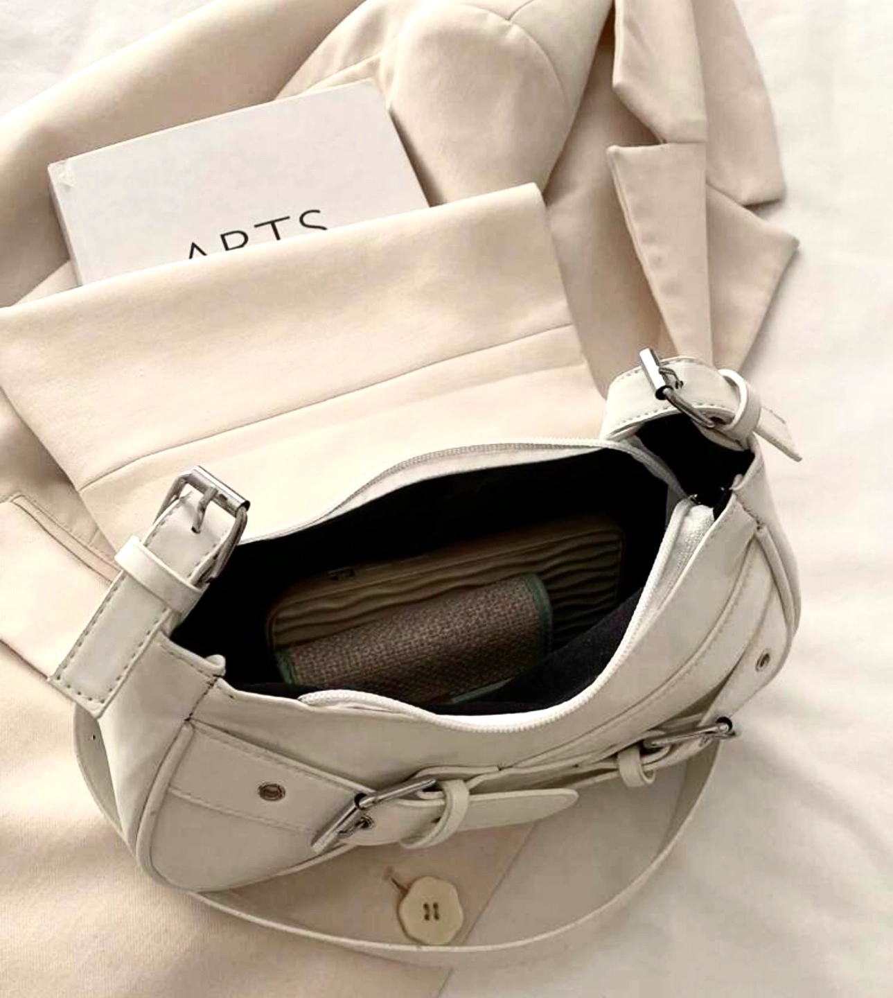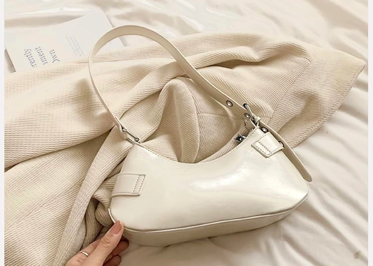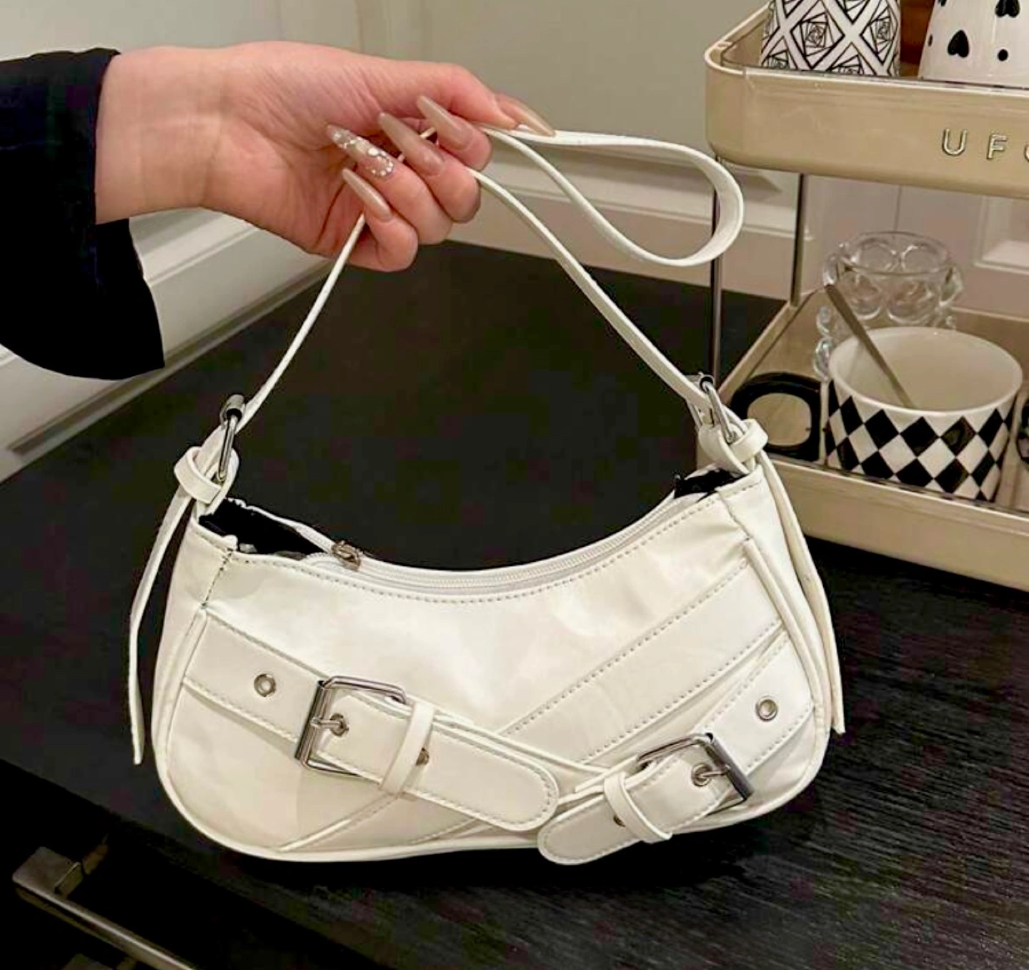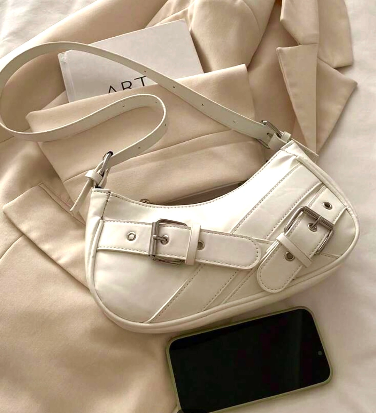 Features a curved silhouette, silver buckles, shoulder strap. Zipper closure. Cool style look
