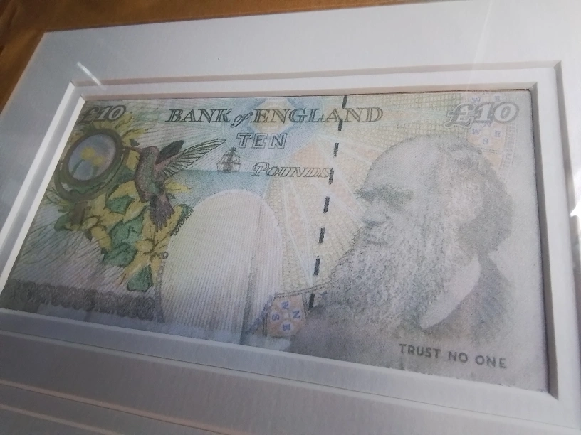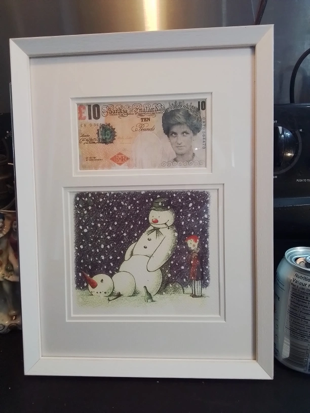 114Framed Banksy artwork featuring a modified £10 note and a snowman illustration Framed Litho Rude Snowman & Banknote Attr. Banksy Lithograph on paper, framed. Featuring Bank of England 10 pound bank note and rude snowman below. Verso stamped BANKSY. Attributed to Banksy (born 1974, British). Framed: 35 x 26 cm (13.75 x 10.25 inches). Bill (top): 7 x 13 cm (2.75 x 5 inches). Bill (Snowman): 14 x 15 cm (5.25 x 6 inches). PROVENANCE: This lot carries limited provenance from a Private British estate Double-framed artwork. Features a modified £10 note with Princess Diana's image and a whimsical snowman illustration. Unique piece, perfect for collectors. White frame. Pickup at Young Street and Steels Ave
