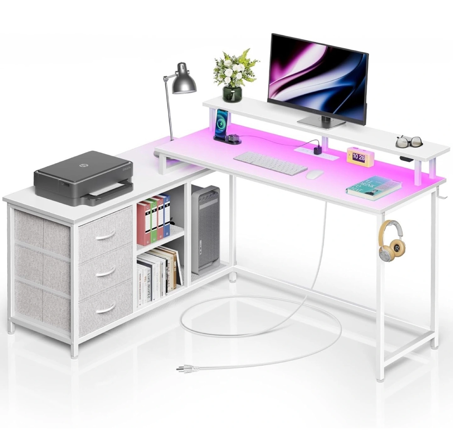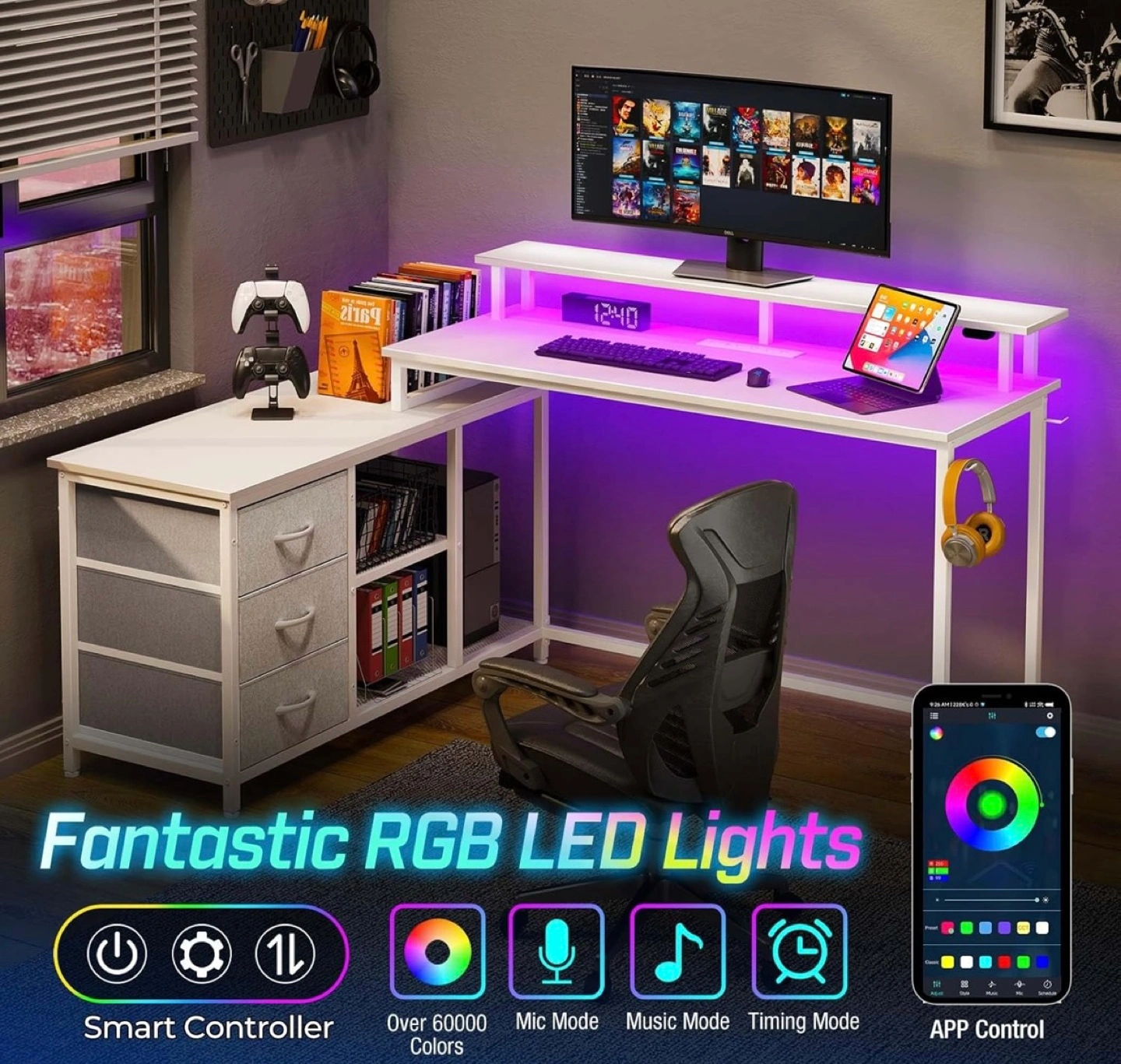 Spacious L-shaped computer desk. Features RGB LED lights, controllable via app or smart controller. Includes built-in power outlets and USB ports. L-shaped design maximizes space. Ample storage with drawers and shelves. Modern and stylish design.