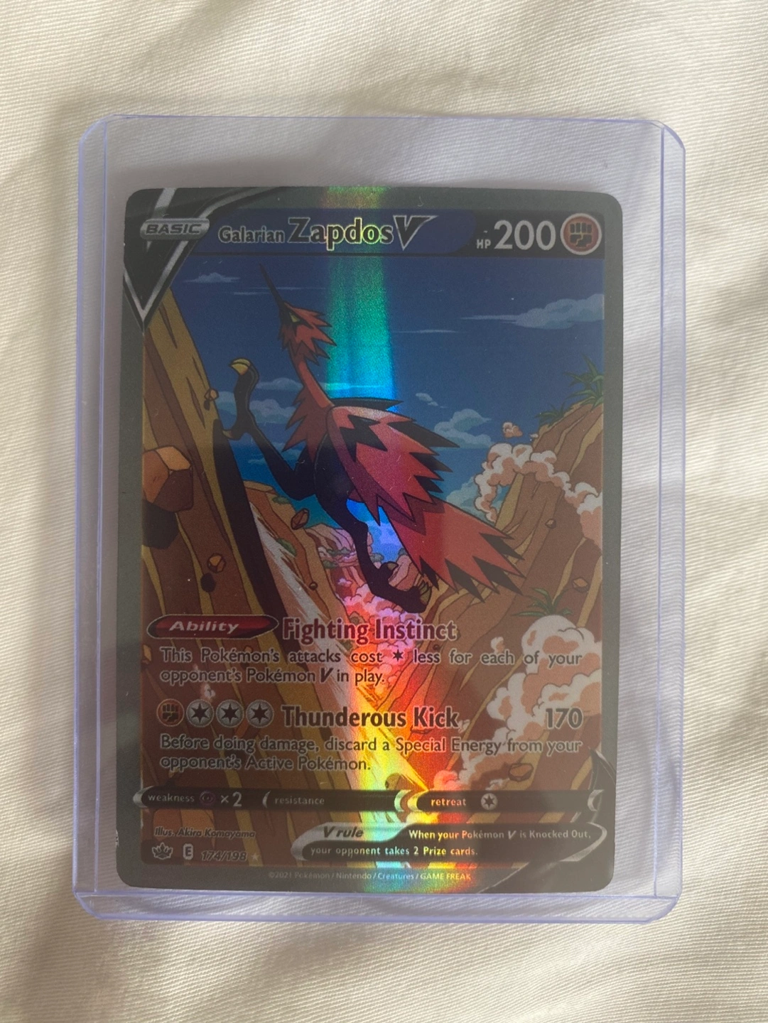 Pokemon card featuring Galarian Zapdos V. Part of the Vivid Voltage set. Card number 172/189. Protected in a hard plastic case.