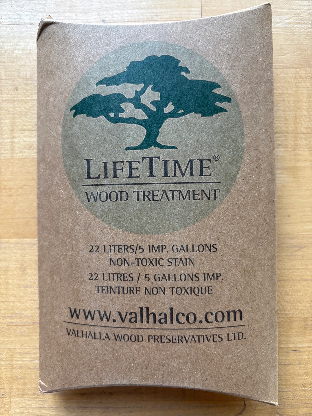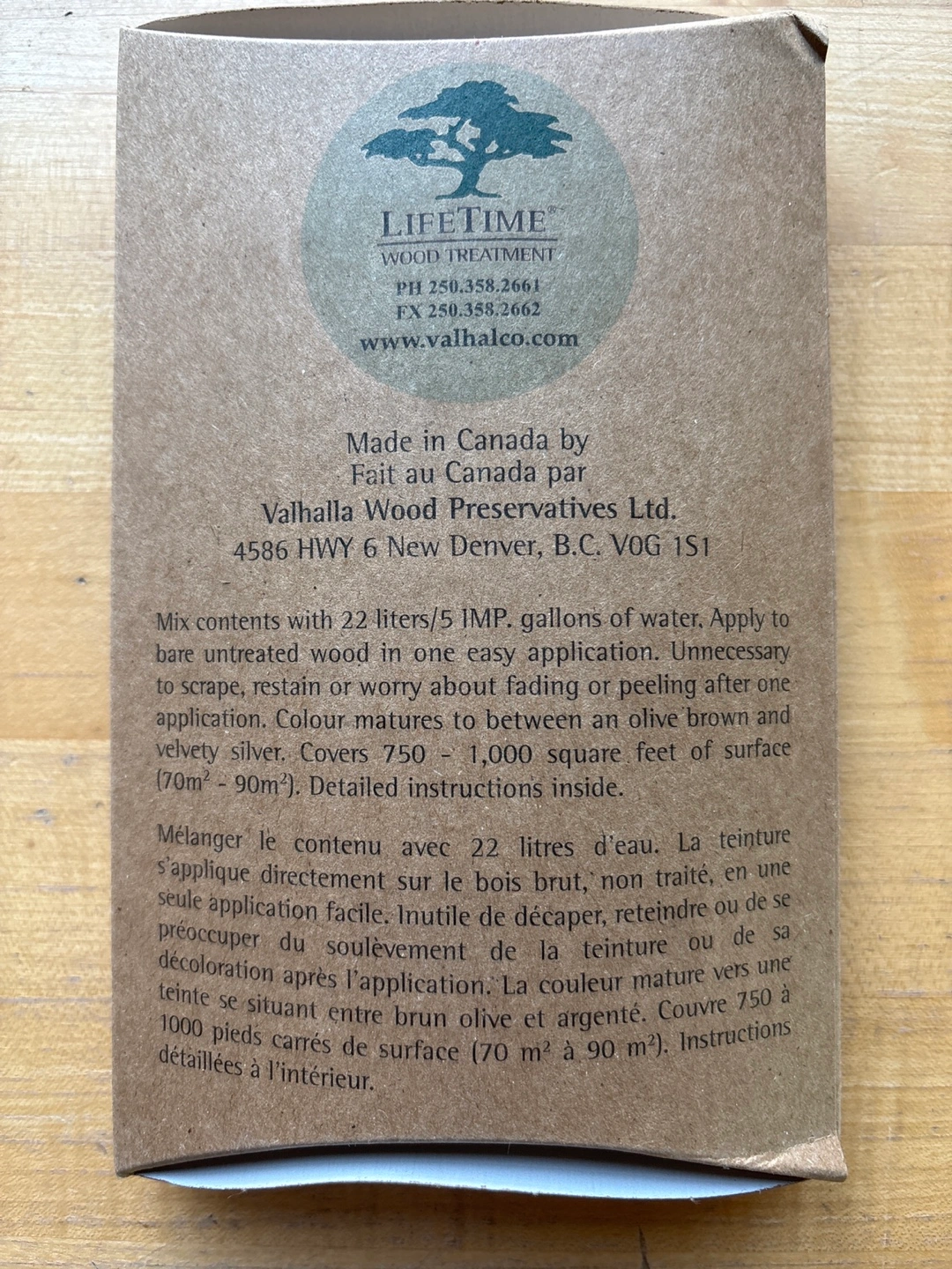 Non-toxic wood stain. Made in Canada by Valhalla Wood Preservatives Ltd. Covers 750-1000 square feet. Instructions included.