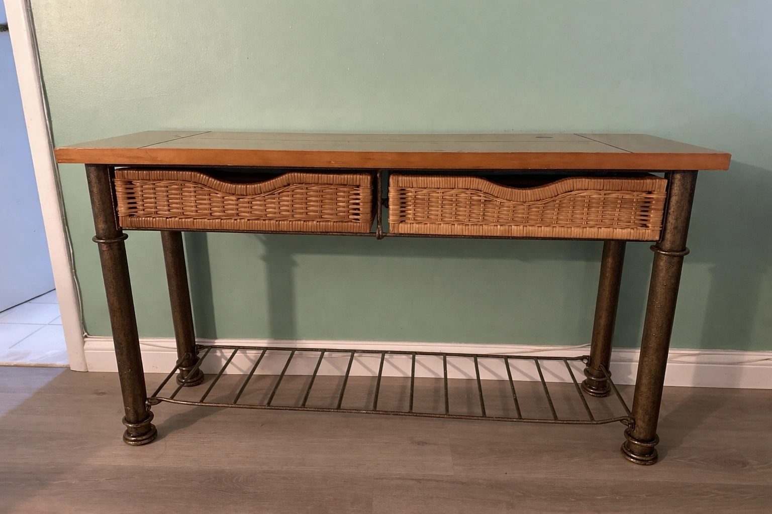 A stylish console table featuring two charming wicker baskets. The table has a wooden top and metal legs, perfect for adding a touch of rustic elegance to your entryway or living room