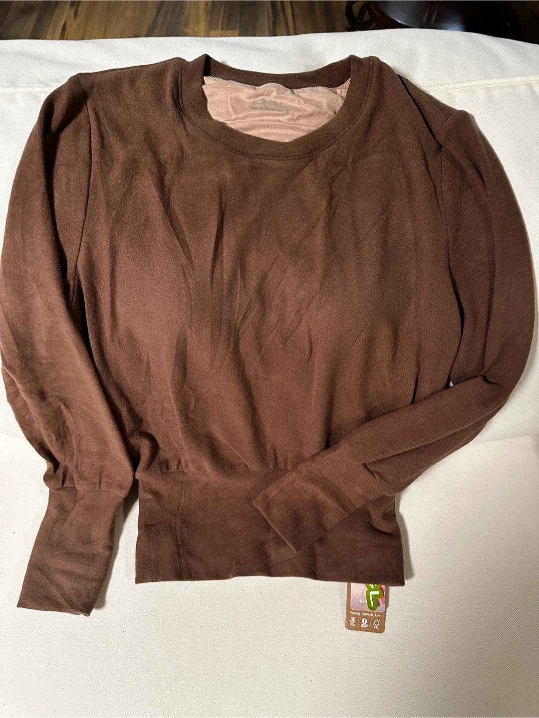 Cozy OGL EcoMousse crewneck sweater in a beautiful mocha colour! A soft brushed fabric with brami and a banded hem. It's made with a blend of viscose, acrylic, and cotton for a soft and comfortable feel. Originally bought for $79. Fits more like Size S around the hip for this particular colour.