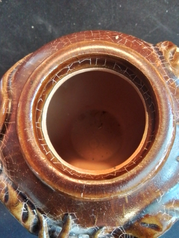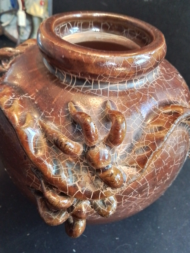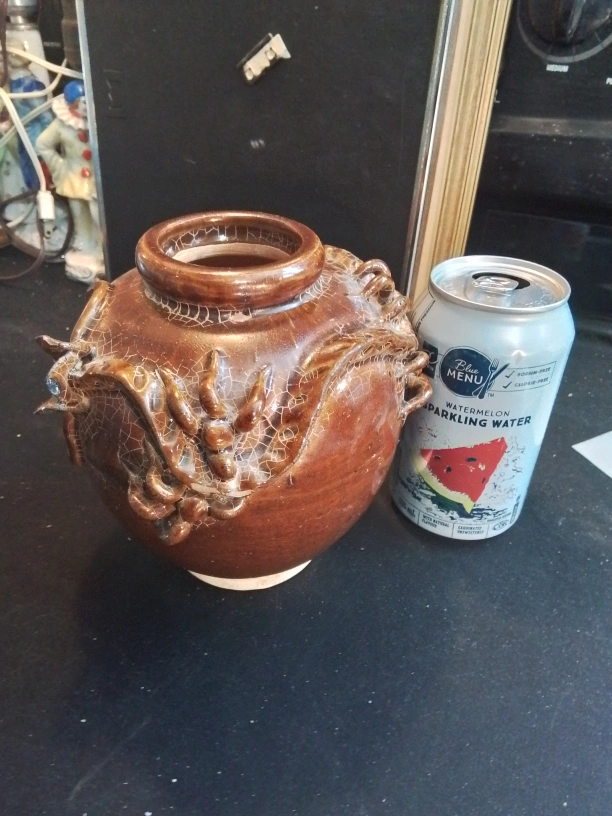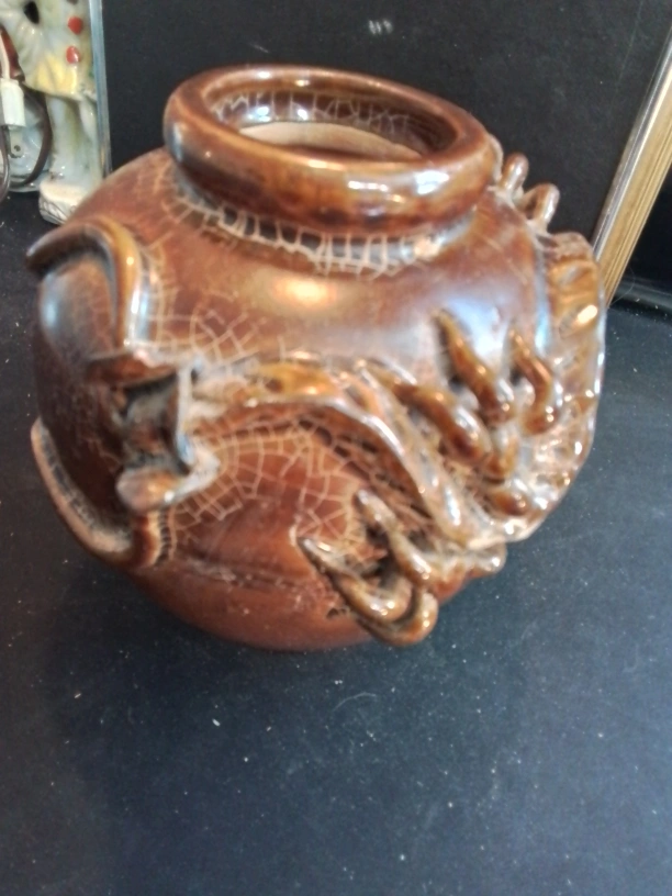 114Chinese Brown Porcelain Dragon Vase Vintage Brown Ceramic Dragon Pot Chinese porcelain vase. Featuring ovoid form body. Supported on short foot rim with a carved dragon on shoulder. Covered with brown crackle glaze; 13.5 cm x 12 cm, 554 grams Unique vintage ceramic pot. Brown glaze. Dragon design. Shows some craquelure. Small size. Estimate 150.00 - 300.00 USD Pickup at Young Street and Steels Ave