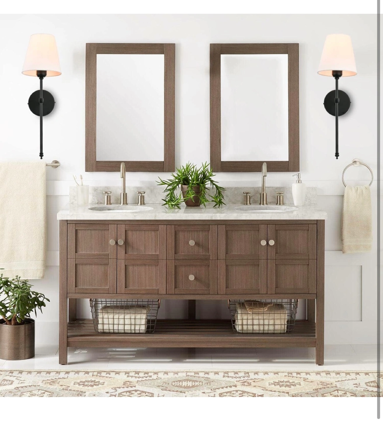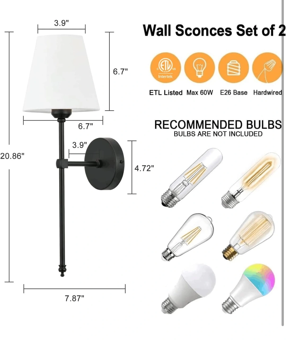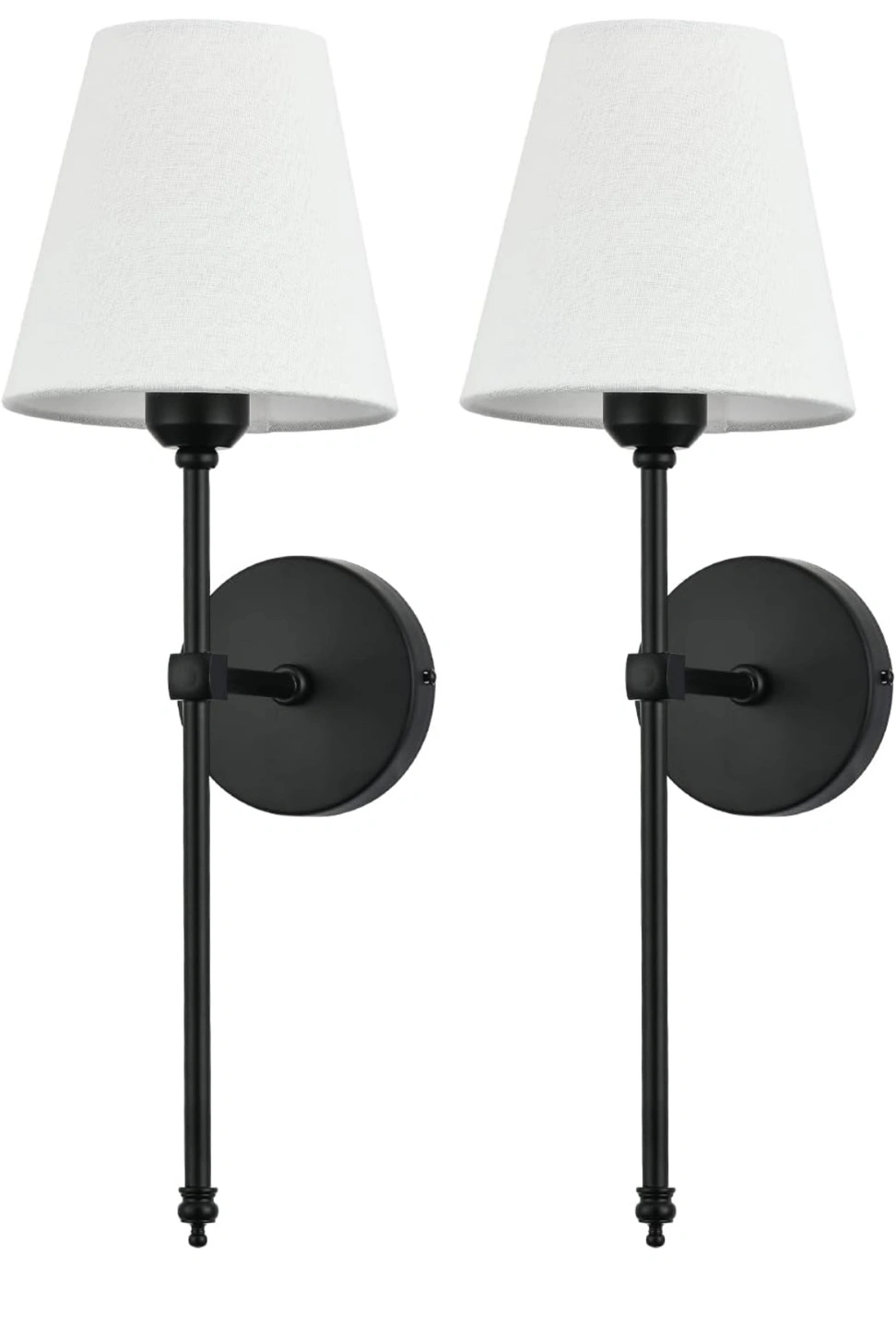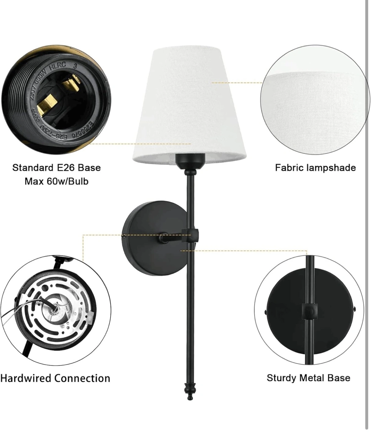 Pair of black metal wall-mounted sconces. Fabric lampshades included. Hardwired; uses E26 bulbs (max 60W). Modern farmhouse style. Easy installation.