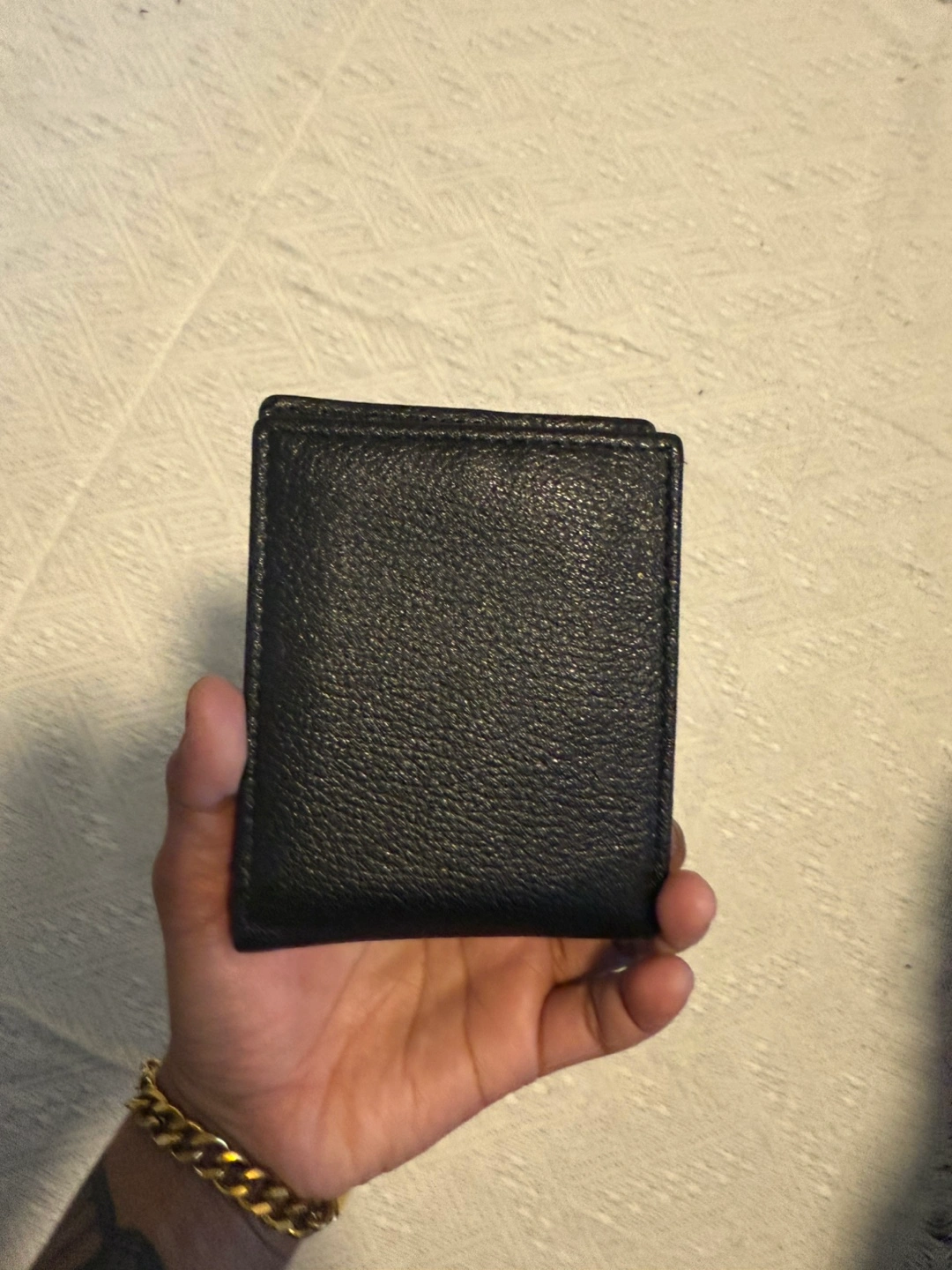 Black leather bi-fold wallet. Multiple card slots and ID window. Good condition. Gently used. No box.