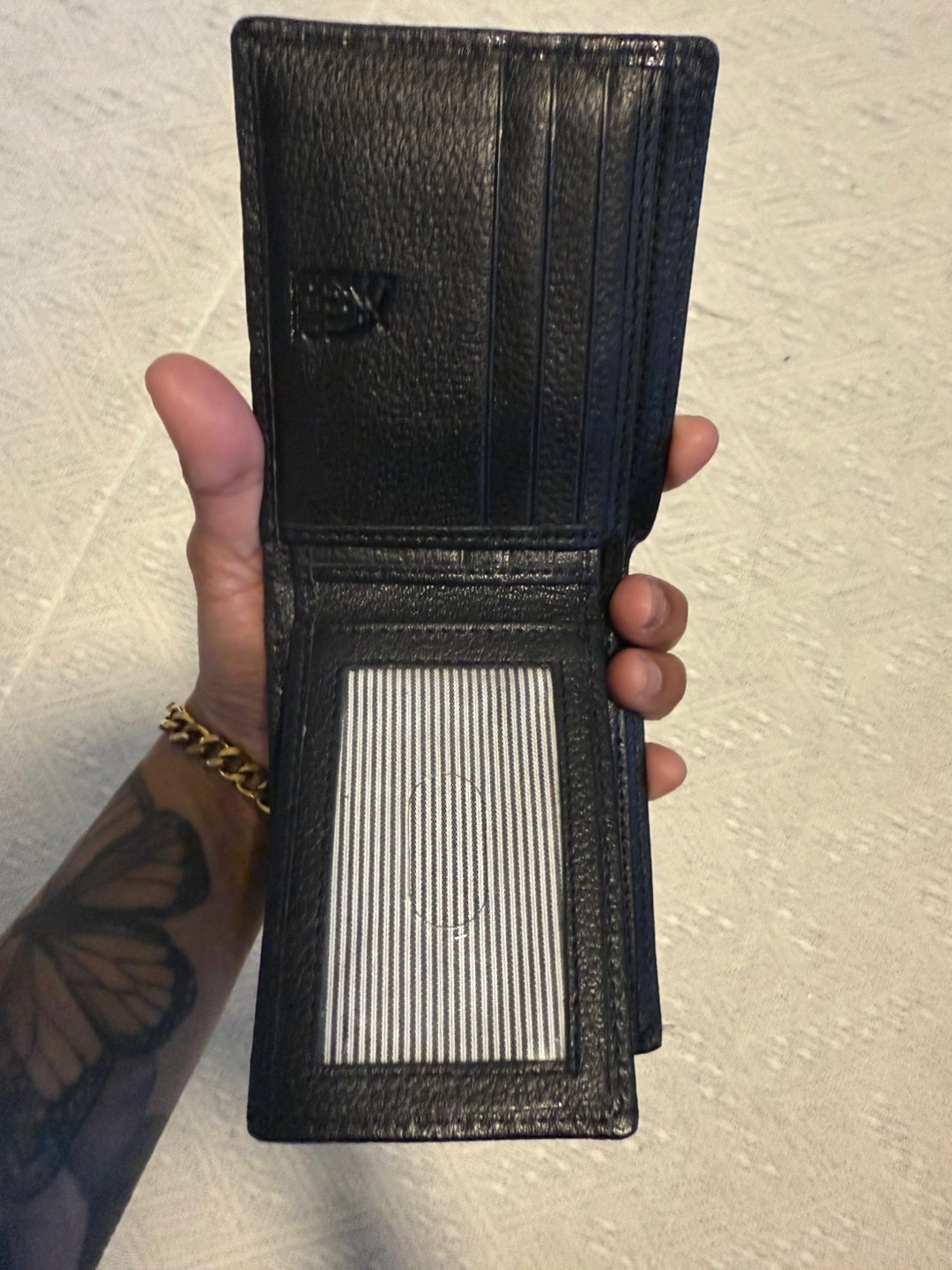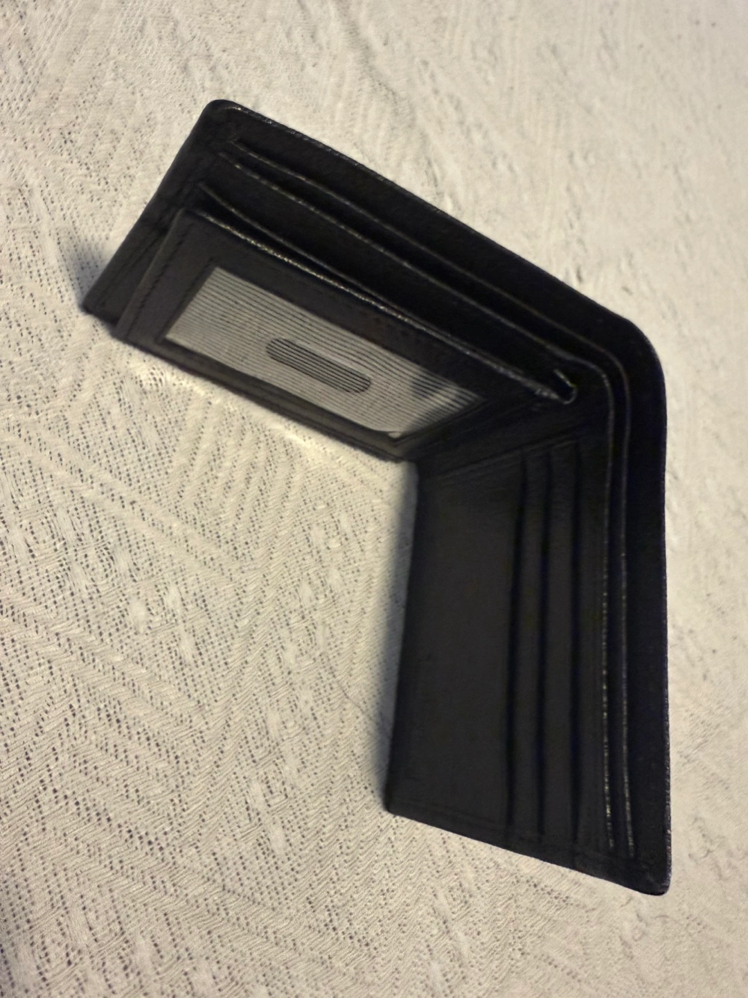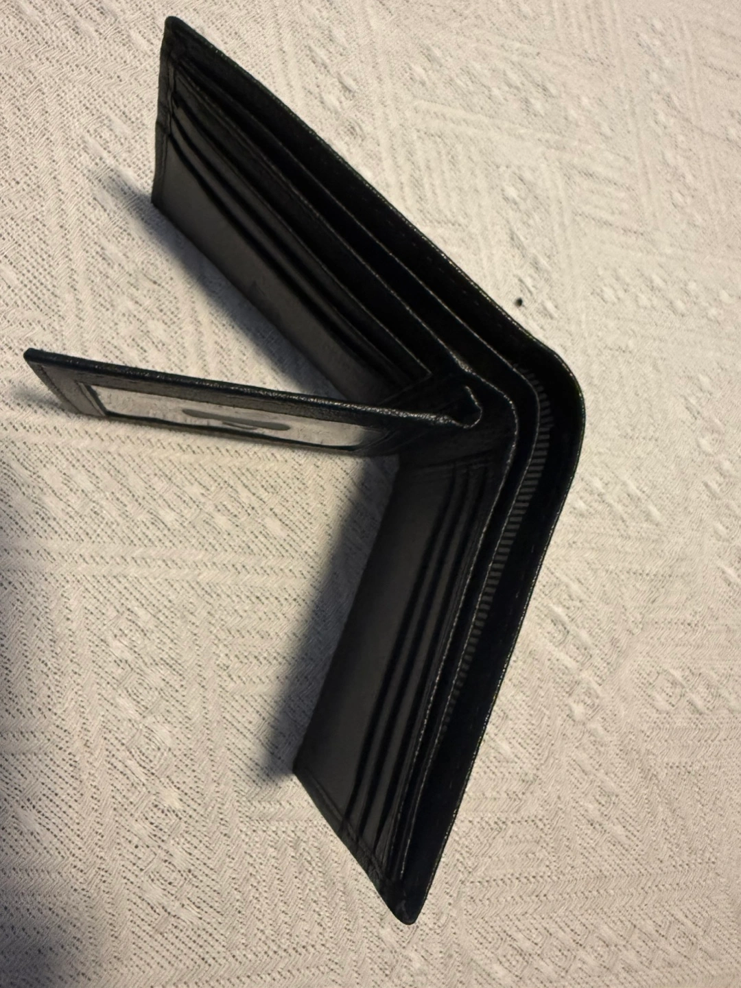 Black leather bi-fold wallet. Multiple card slots and ID window. Good condition. Gently used. No box.