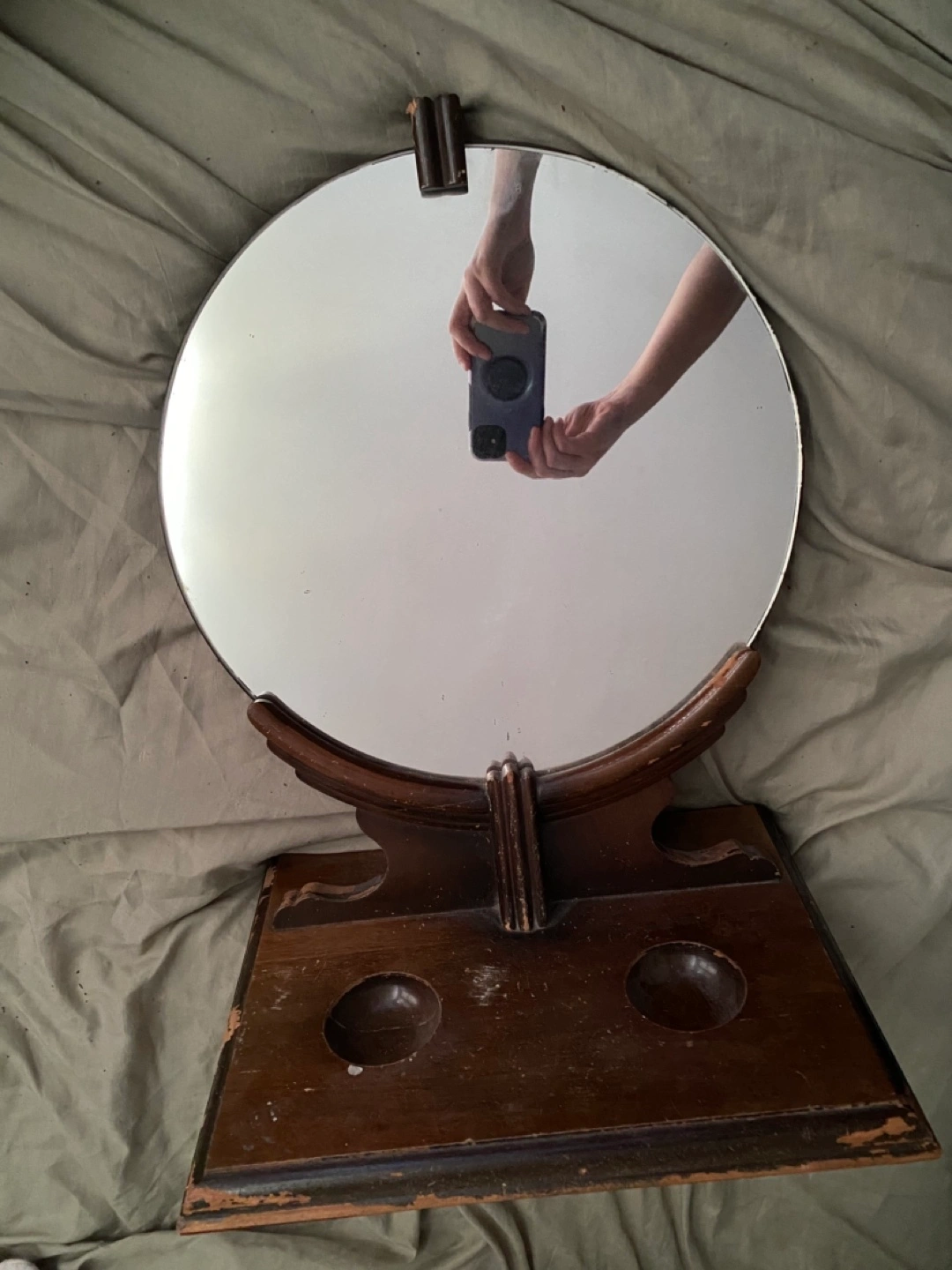 Dark brown wooden frame. Circular mirror. Two small cup holders. Shows some age and wear.