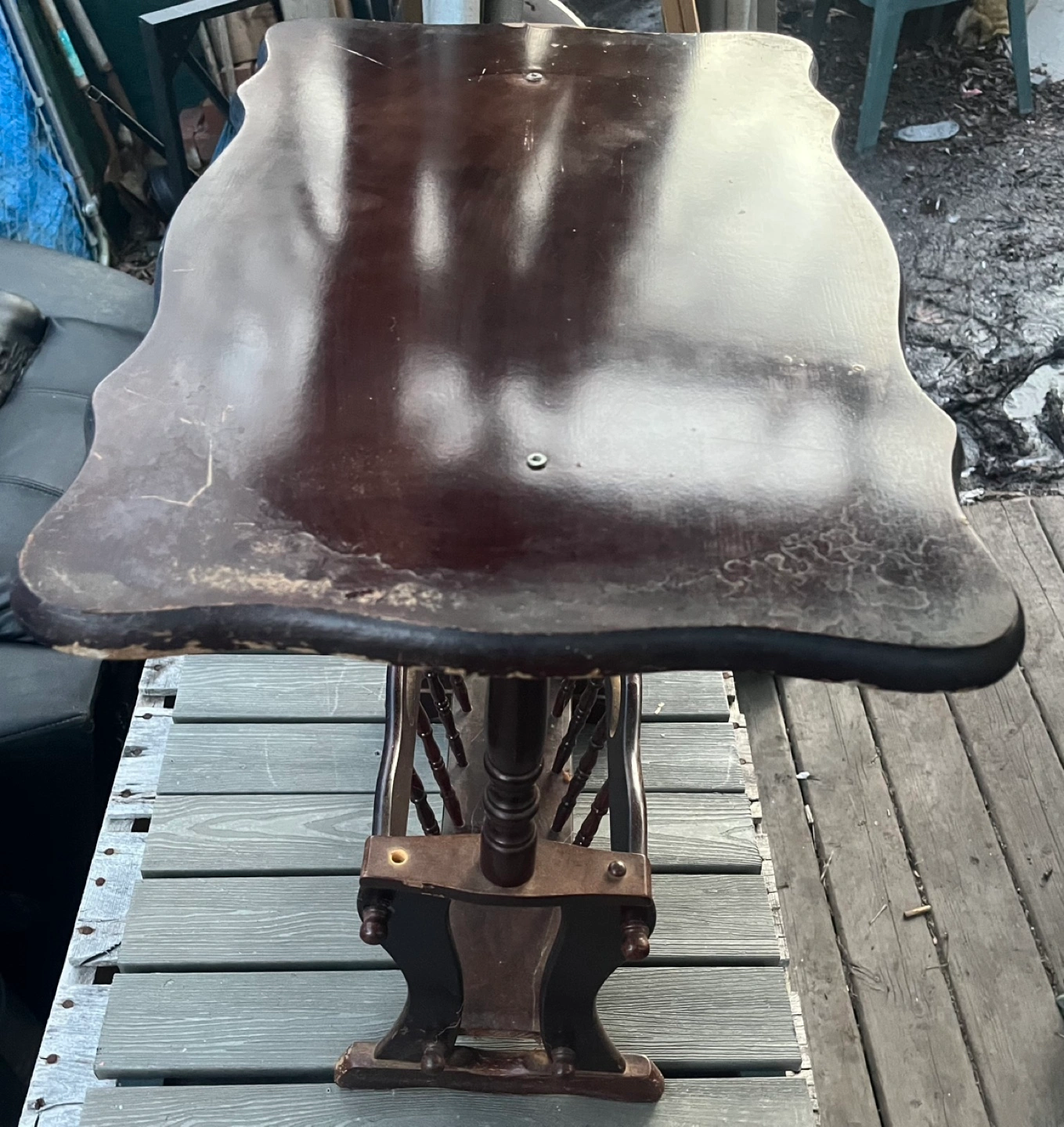 Features a small table top and decorative spindles.