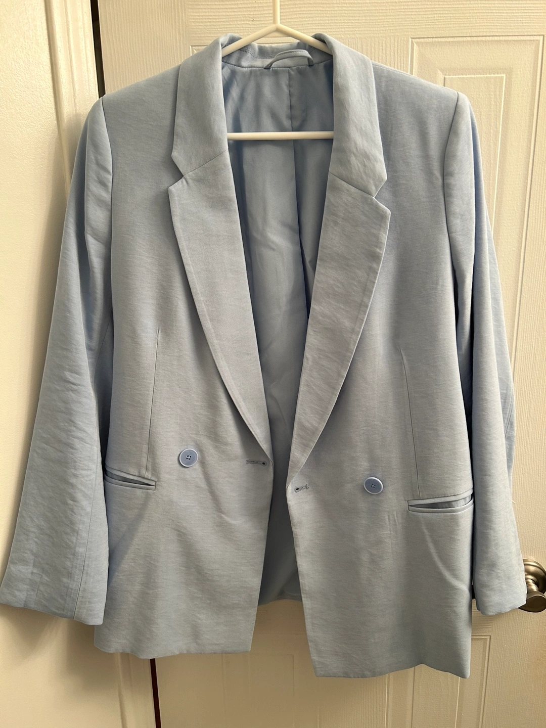 245Women's light blue blazer. Double-breasted design. Long sleeves. Two front pockets. Relaxed fit. Made in Myanmar. Never wore it, so selling Light fabric Pick up from Hillcrest Mall, Richmond Hill