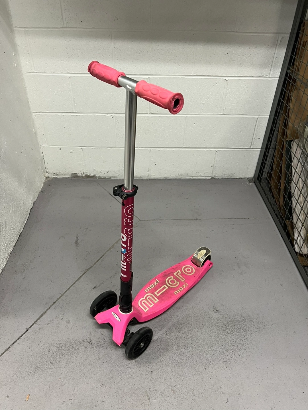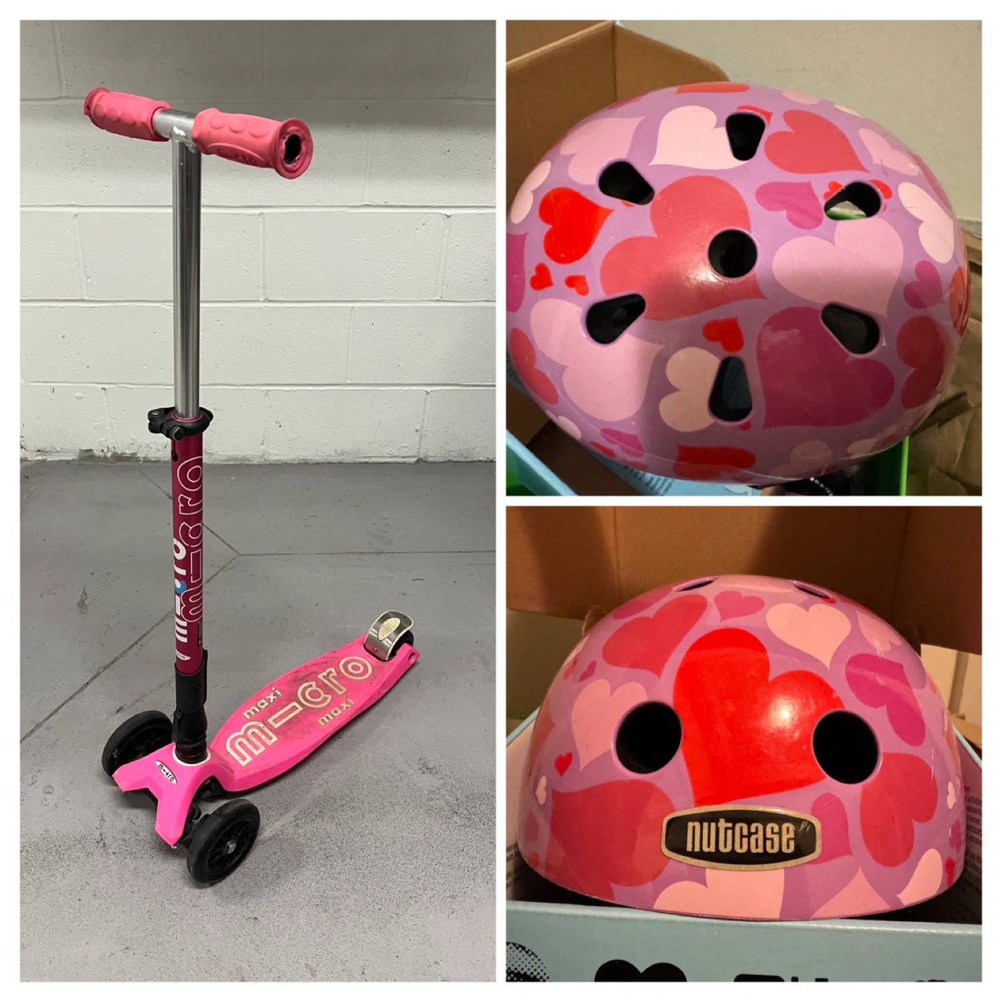 Pre-owned children's scooter and helmet set. Pink Micro Maxi scooter, Matching pink Nutcase helmet, hearts design.