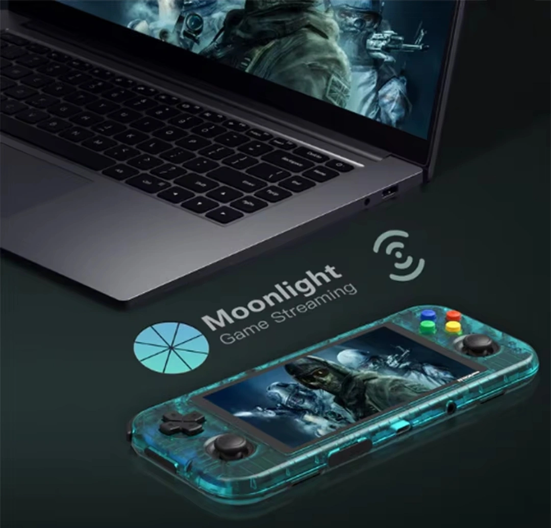 Portable gaming device. Features a 4GB LPDDR4x RAM and 128GB eMMC storage. Clear teal translucent casing. Uses Unisoc T618 processor. Moonlight game streaming compatible. 4500mAh battery.