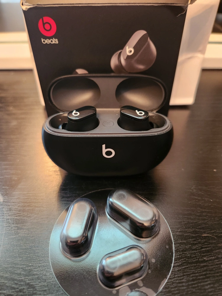 Wireless earbuds with charging case. Active noise cancellation and transparency mode. Does not include charging cable or block. Only used a couple times. Works no issue. Can test on site. Includes extra ear tips.