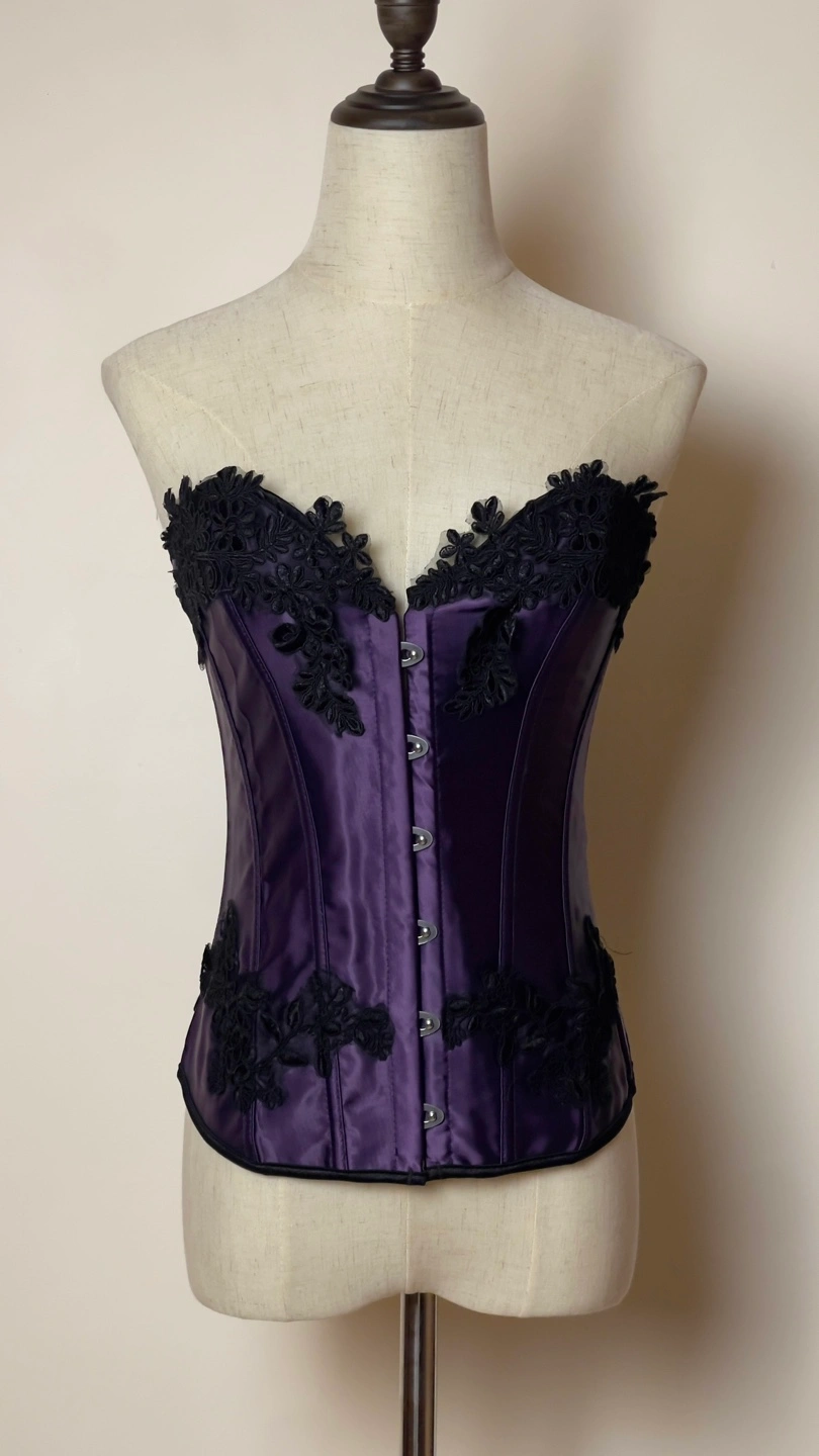 Gorgeous purple satin corset. Features black lace accents. Lace-up back. Metal hooks and eyes at the front. Excellent condition.