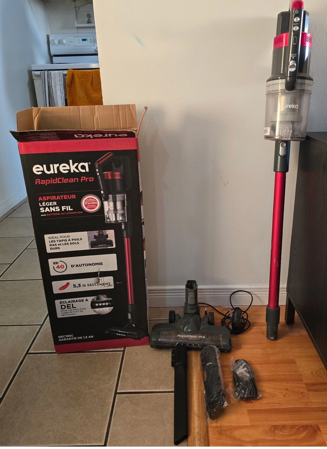 Lightweight stick vacuum. Red and grey. Includes attachments. Good for various floors. 25.2V.