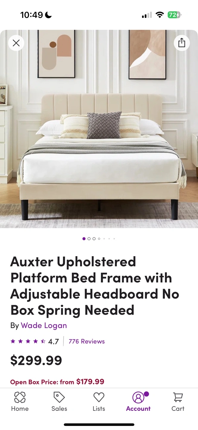 Queen size platform bed frame. Beige upholstery. Adjustable headboard. No box spring needed. Pretty much brand new. Selling for $200.