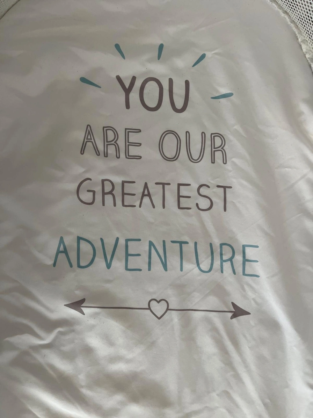 Grey and white baby bassinet. Features a quilted design and storage underneath. Includes fitted sheet with text.
