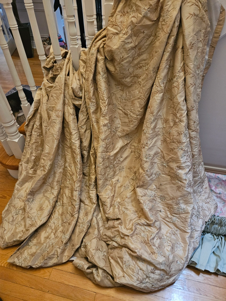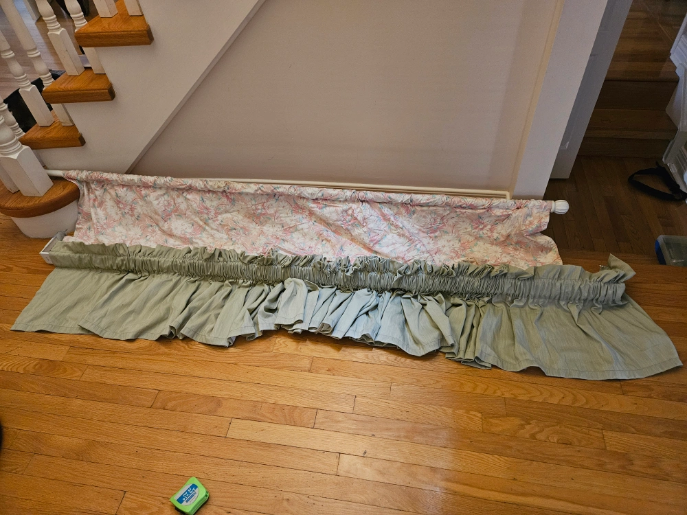window treatments.1 long beige curtains with floral pattern. Two valances, one pale green and one pink white curtain rod is 81" long give or take other is 83" l give or take. only best offer pls