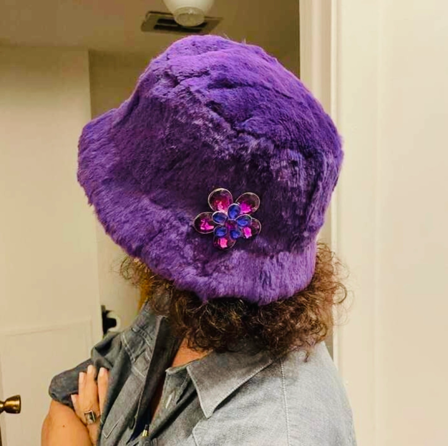 Unique purple rabbit fur bucket hat. Free Vintage flower brooch included.Soft and warm. Perfect for a stylish look.