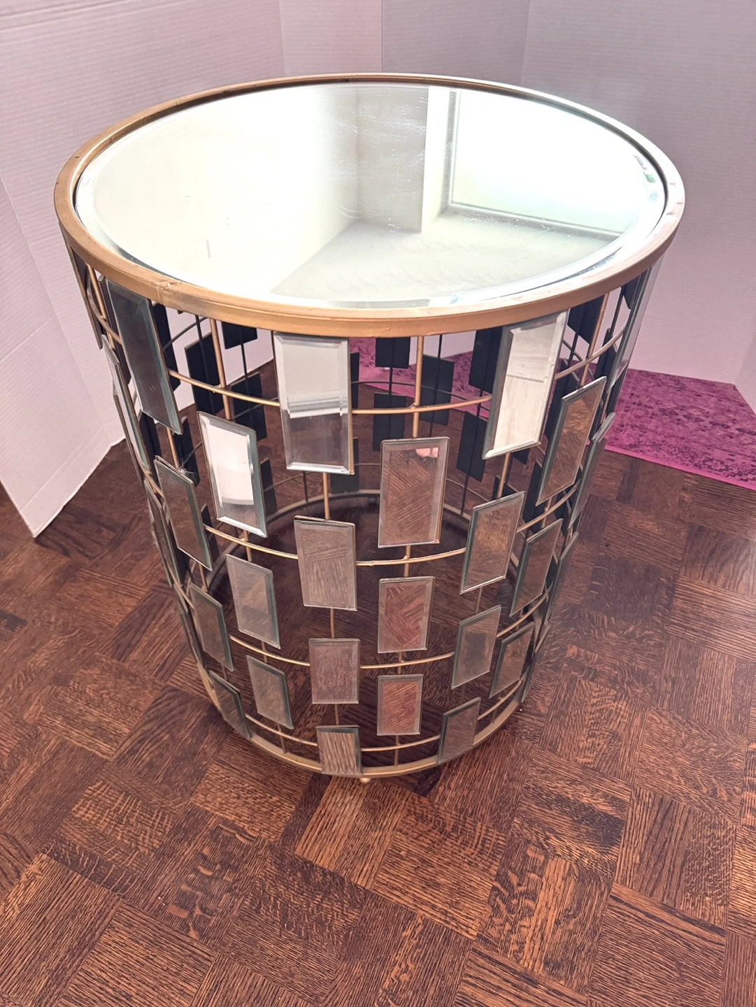 Unique side table. Gold metal frame. Mirrored panels. Glass top. Stylish addition to any room. Excellent condition. Pick up only. Cash preferred