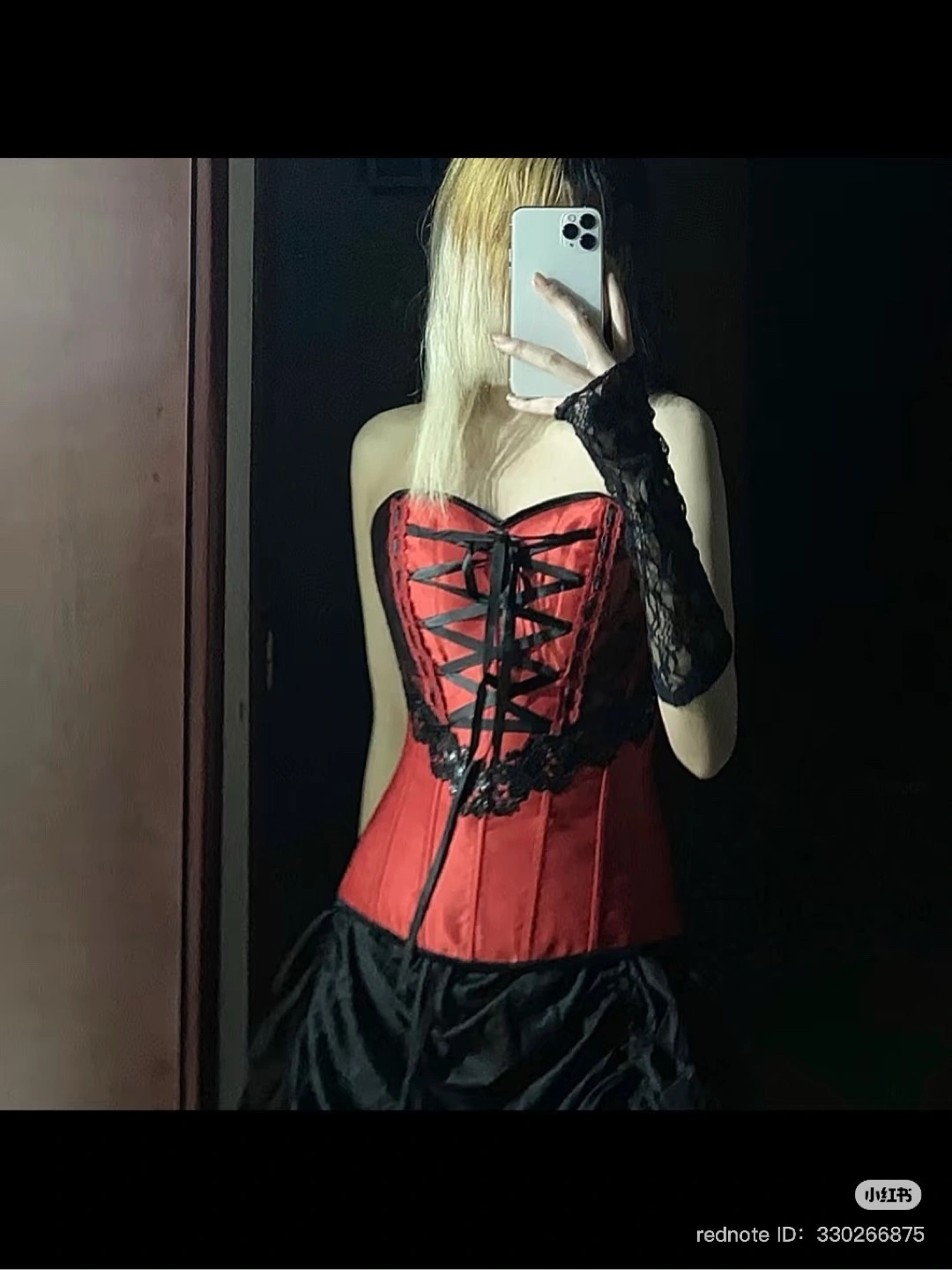 Beautiful red corset with black lace detail. Features a front lace-up closure and a back zipper. Perfect for a special occasion or costume.
